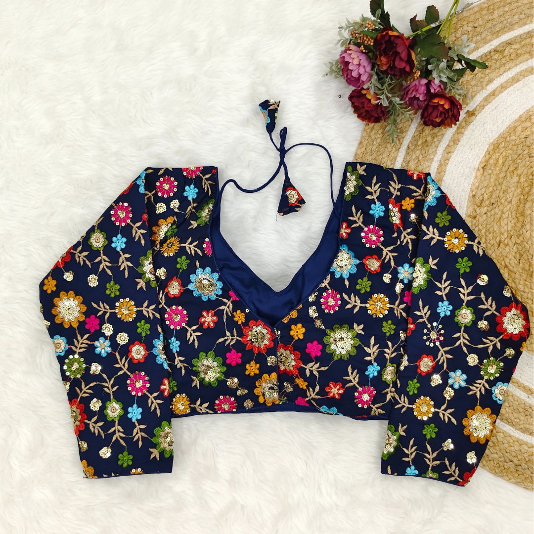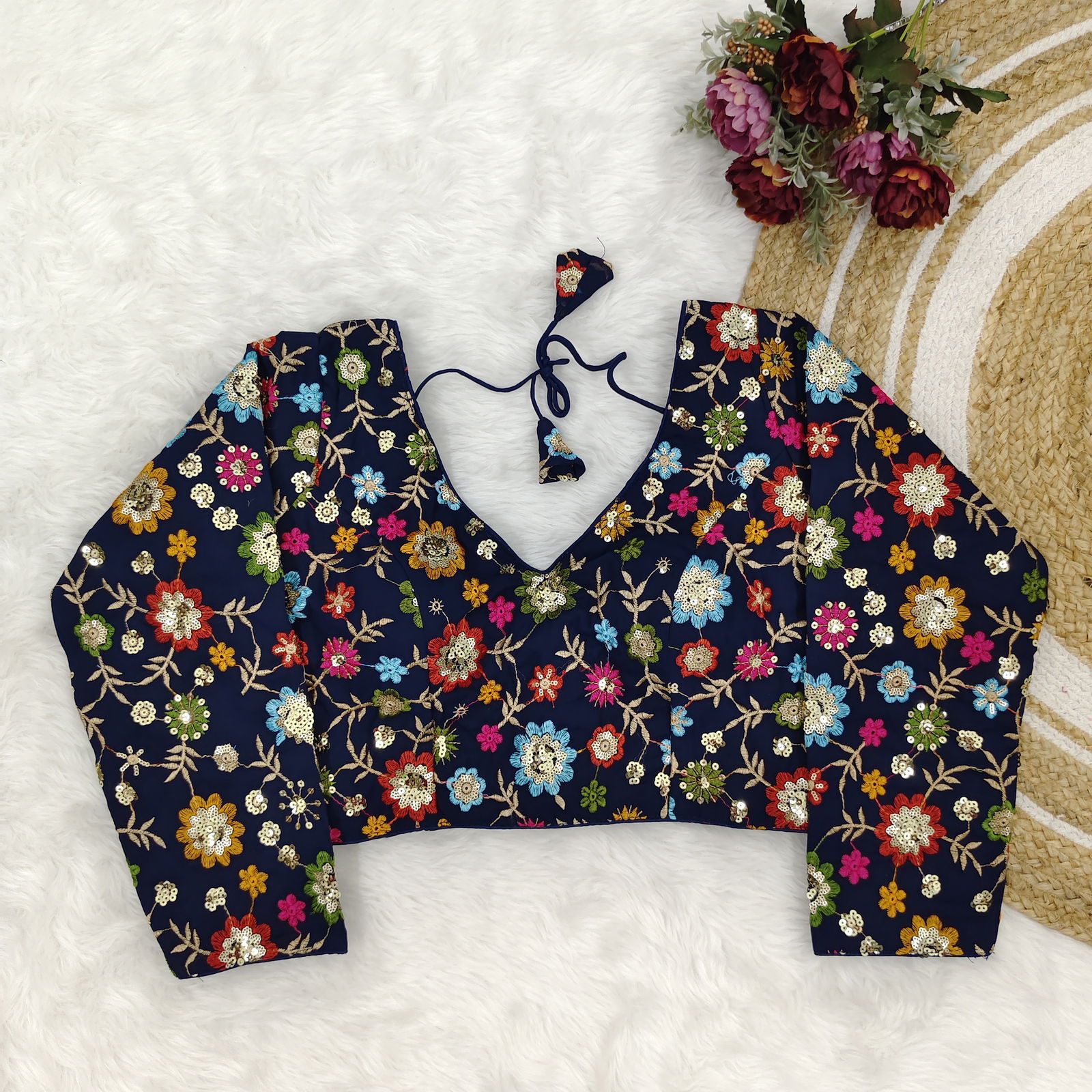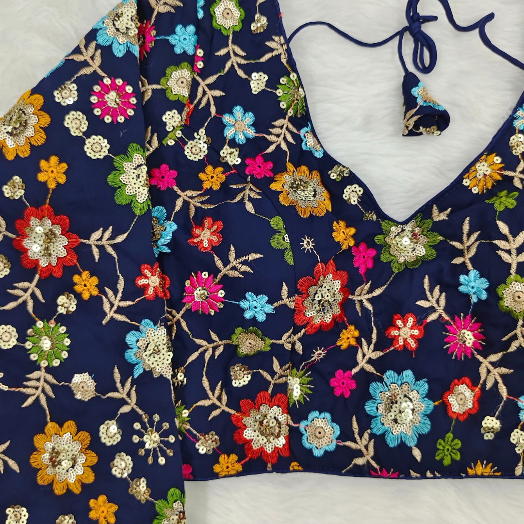 Stunning fox georgette blouse with intricate sequence work, featuring a stylish open-back design