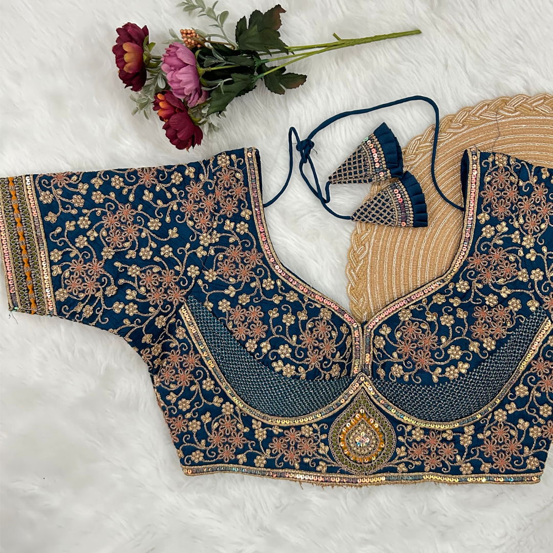 Make a statement with this partywear designer blouse featuring heavy codding embroidery, thread, and sequence work. Made from pure soft Italian silk with tricot fusing, it has heavy padding, intricate bridal design, and a back open style with handmade hooks and latkans. A perfect fit for festive and wedding occasions.