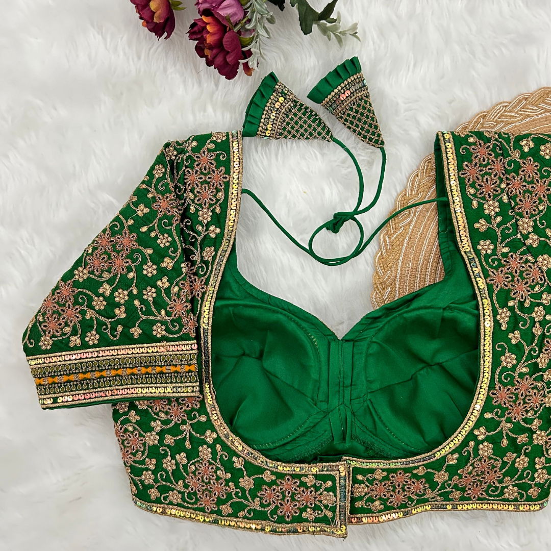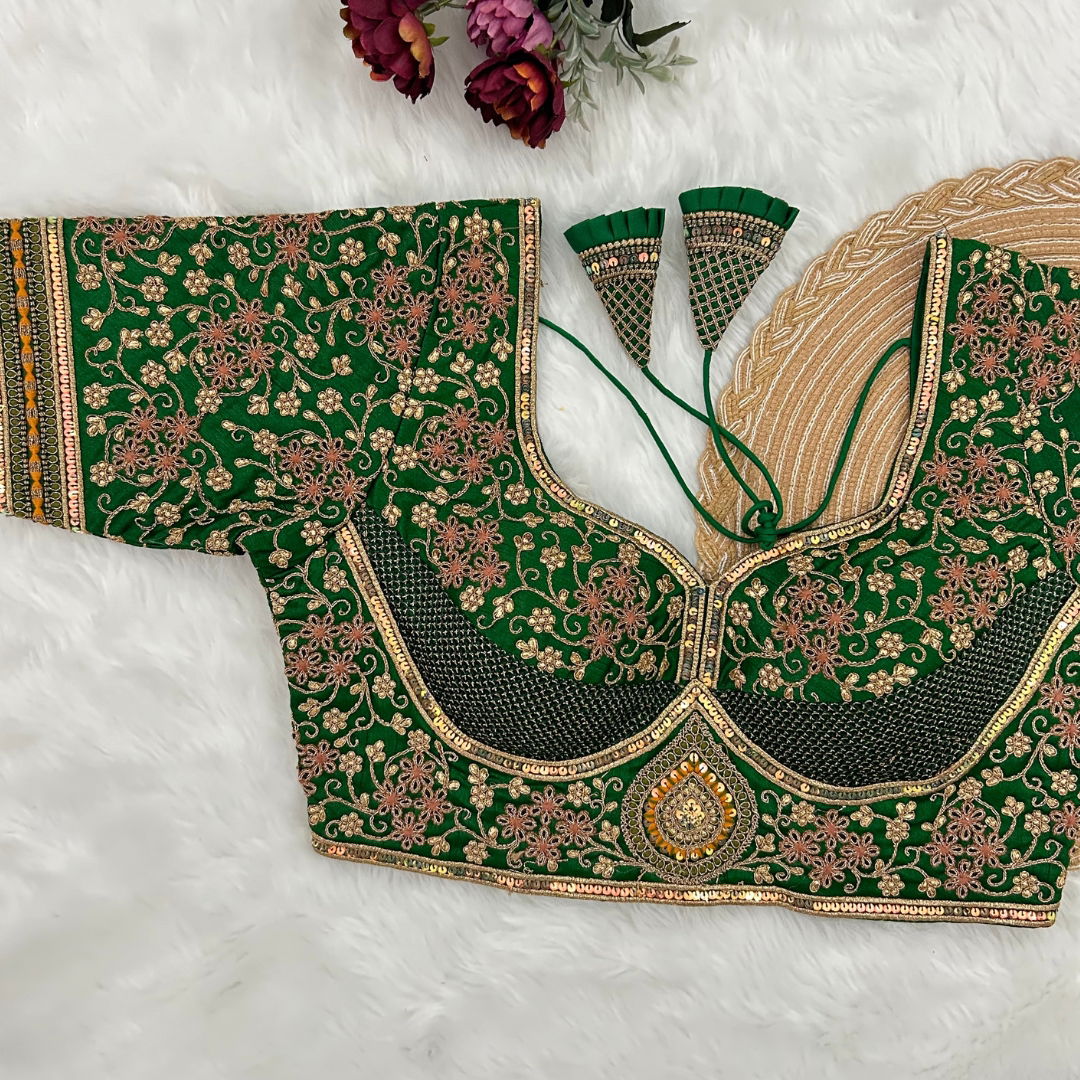 Make a statement with this partywear designer blouse featuring heavy codding embroidery, thread, and sequence work. Made from pure soft Italian silk with tricot fusing, it has heavy padding, intricate bridal design, and a back open style with handmade hooks and latkans. A perfect fit for festive and wedding occasions.