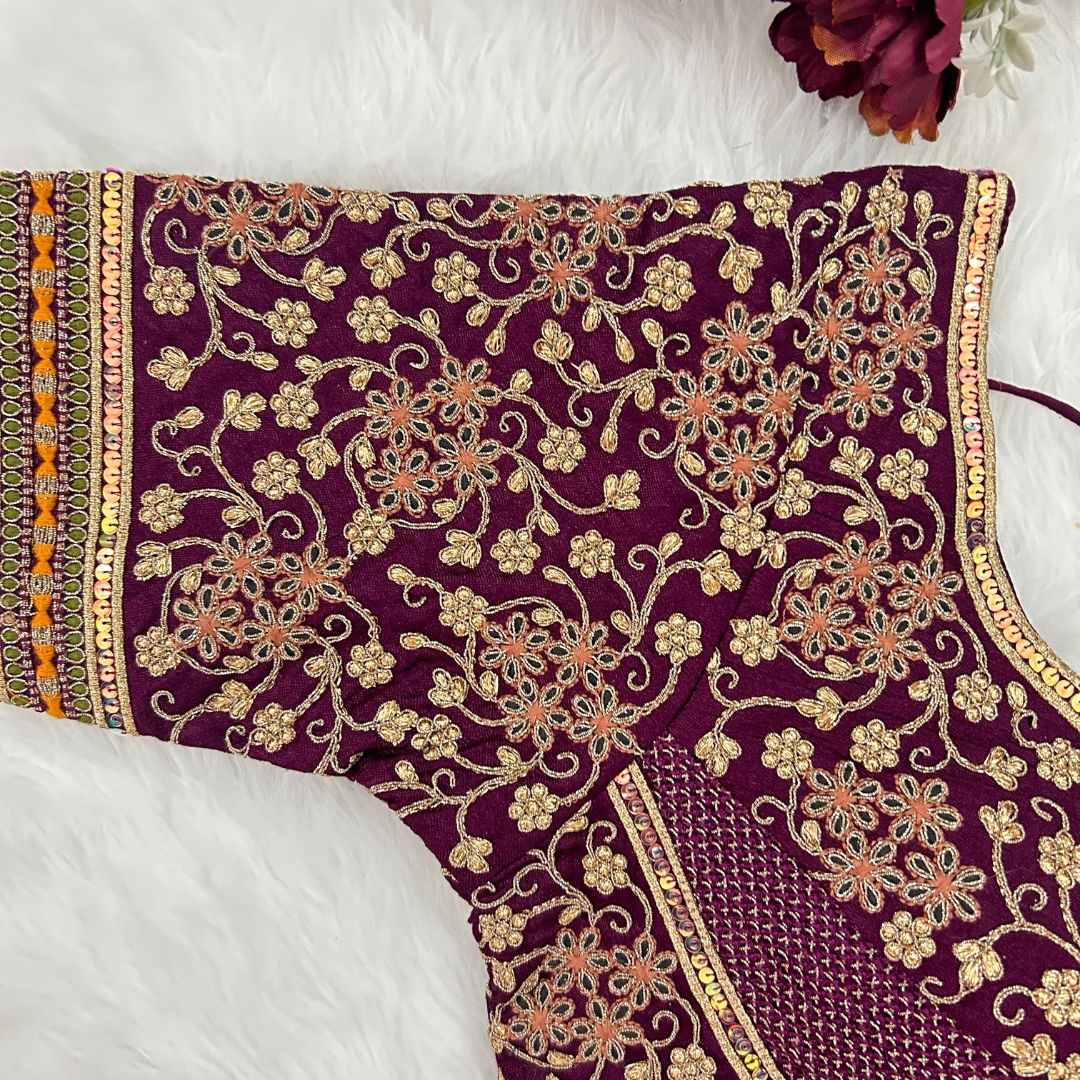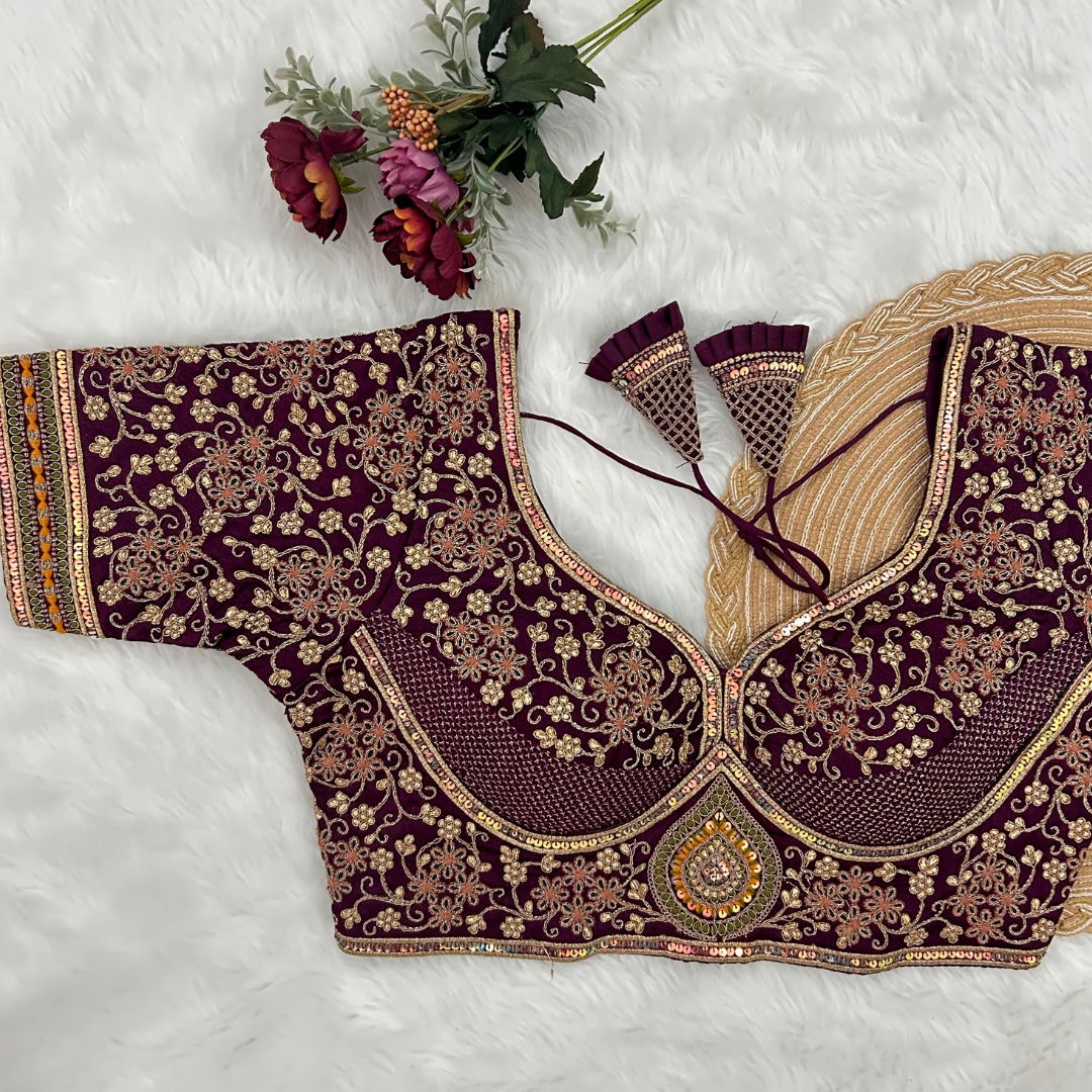 Make a statement with this partywear designer blouse featuring heavy codding embroidery, thread, and sequence work. Made from pure soft Italian silk with tricot fusing, it has heavy padding, intricate bridal design, and a back open style with handmade hooks and latkans. A perfect fit for festive and wedding occasions.