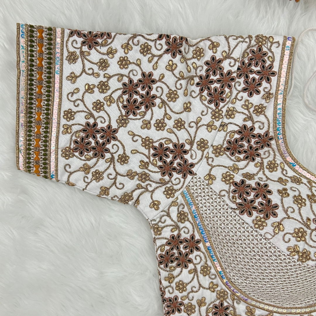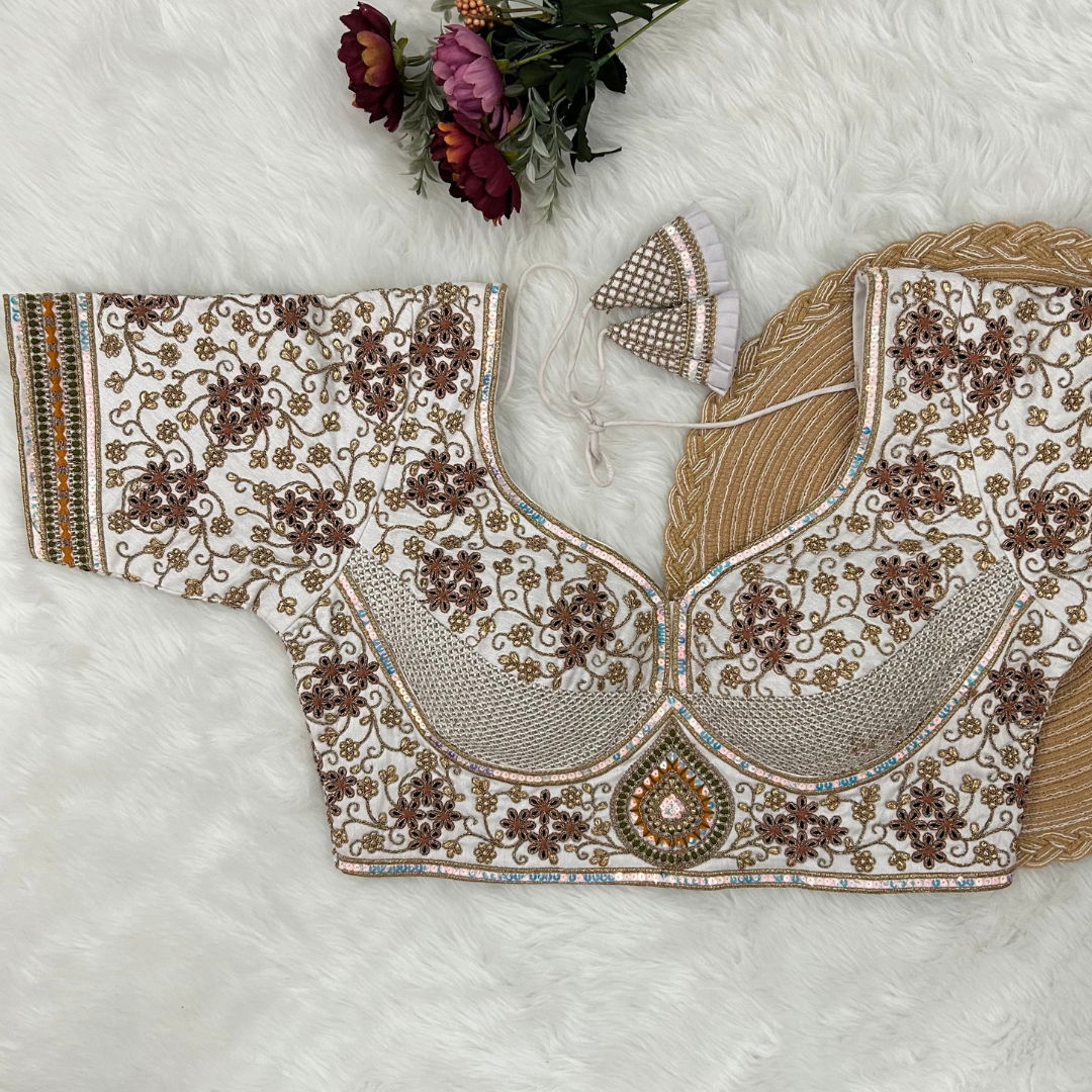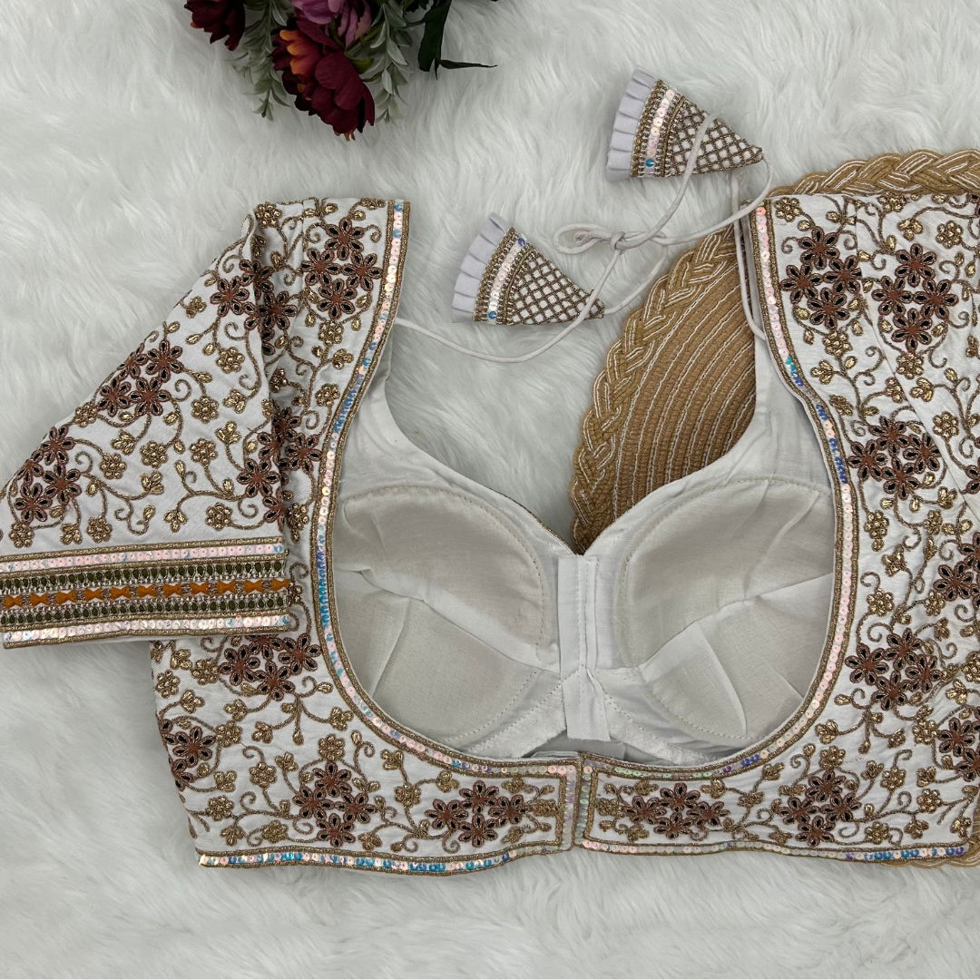 Make a statement with this partywear designer blouse featuring heavy codding embroidery, thread, and sequence work. Made from pure soft Italian silk with tricot fusing, it has heavy padding, intricate bridal design, and a back open style with handmade hooks and latkans. A perfect fit for festive and wedding occasions.