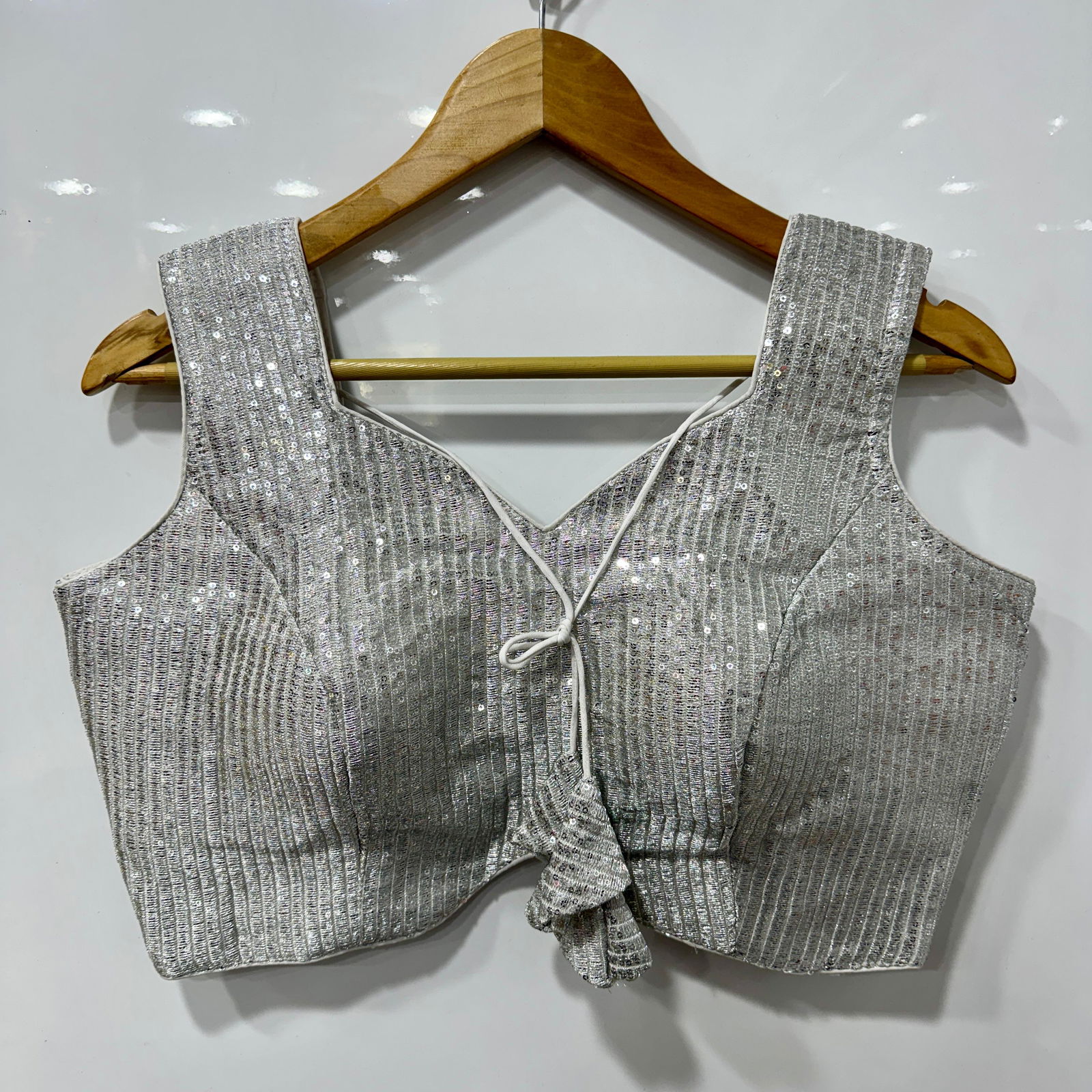 Gorgeous party-ready blouse with shimmering sequins, intricate stitching, heavy padding, and an elegant open-back design.