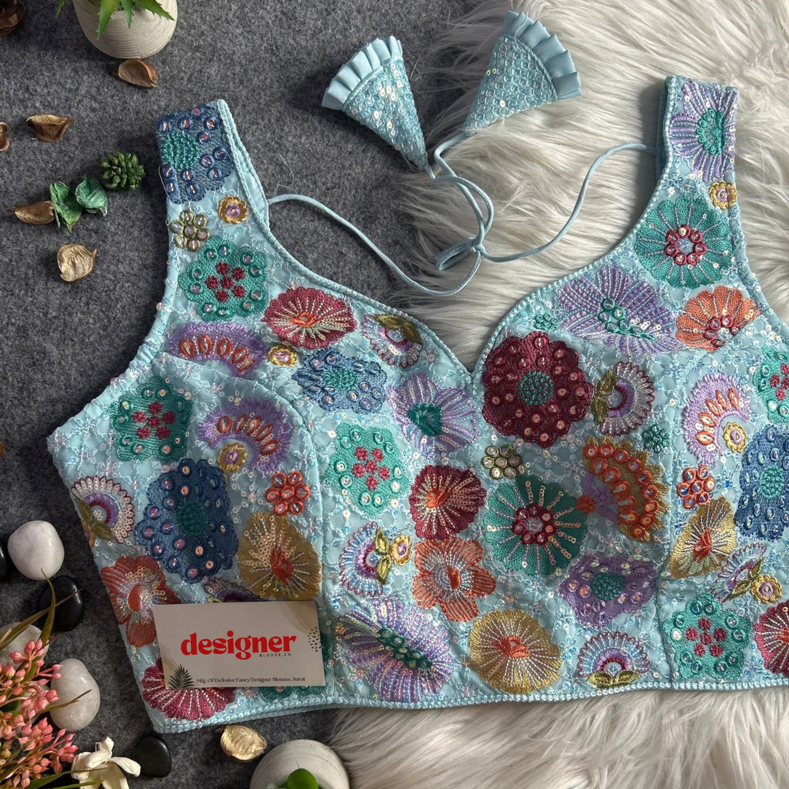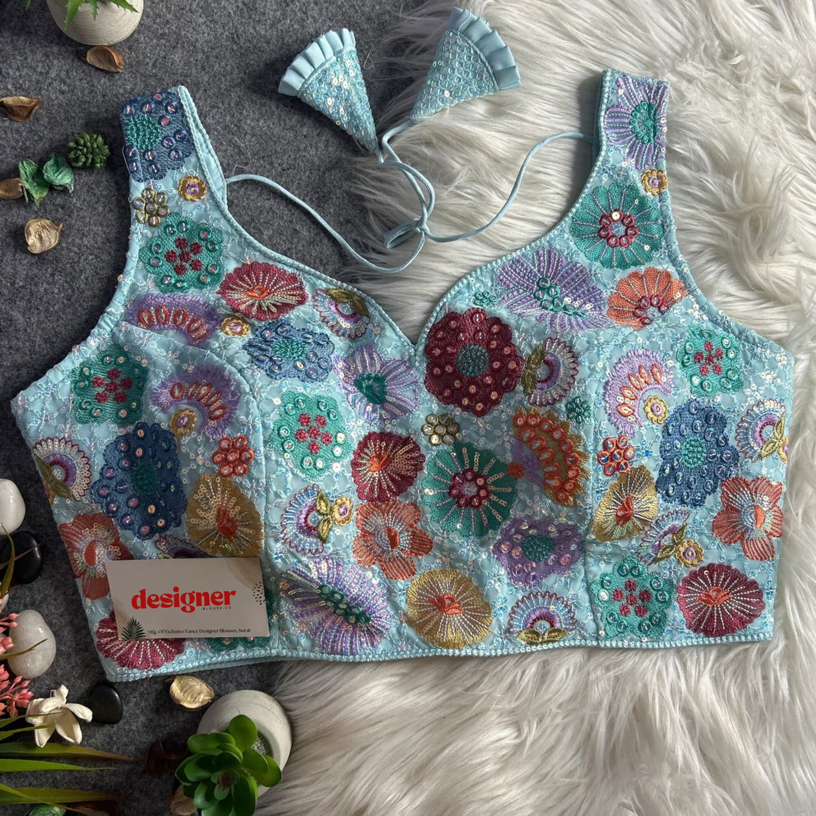 Add glamour to your ethnic wardrobe with this beautiful heavy multi-thread and sequin work blouse. Crafted from premium heavy fox georgette, this blouse features stunning embroidery and sequin detailing, perfect for weddings, parties, and festive occasions.