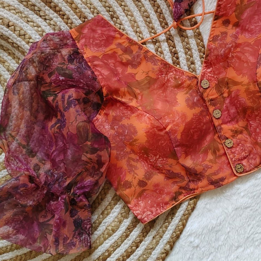 Introducing our exquisite Festival Wear Blouse, a perfect blend of elegance and trendiness. Elevate your festive look with this stunning blouse featuring a beautiful print and a designer-inspired aesthetic. Crafted from high-quality organza fabric, it offers a luxurious feel and a flattering fit for sizes 38 to 42. The 18-inch sleeves add a touch of grace, while the built-in padding ensures comfort and support. Standing at a height of 15 inches, this blouse is a versatile choice for various occasions. Embrace style and sophistication with this must-have addition to your wardrobe, effortlessly enhancing your festive attire.