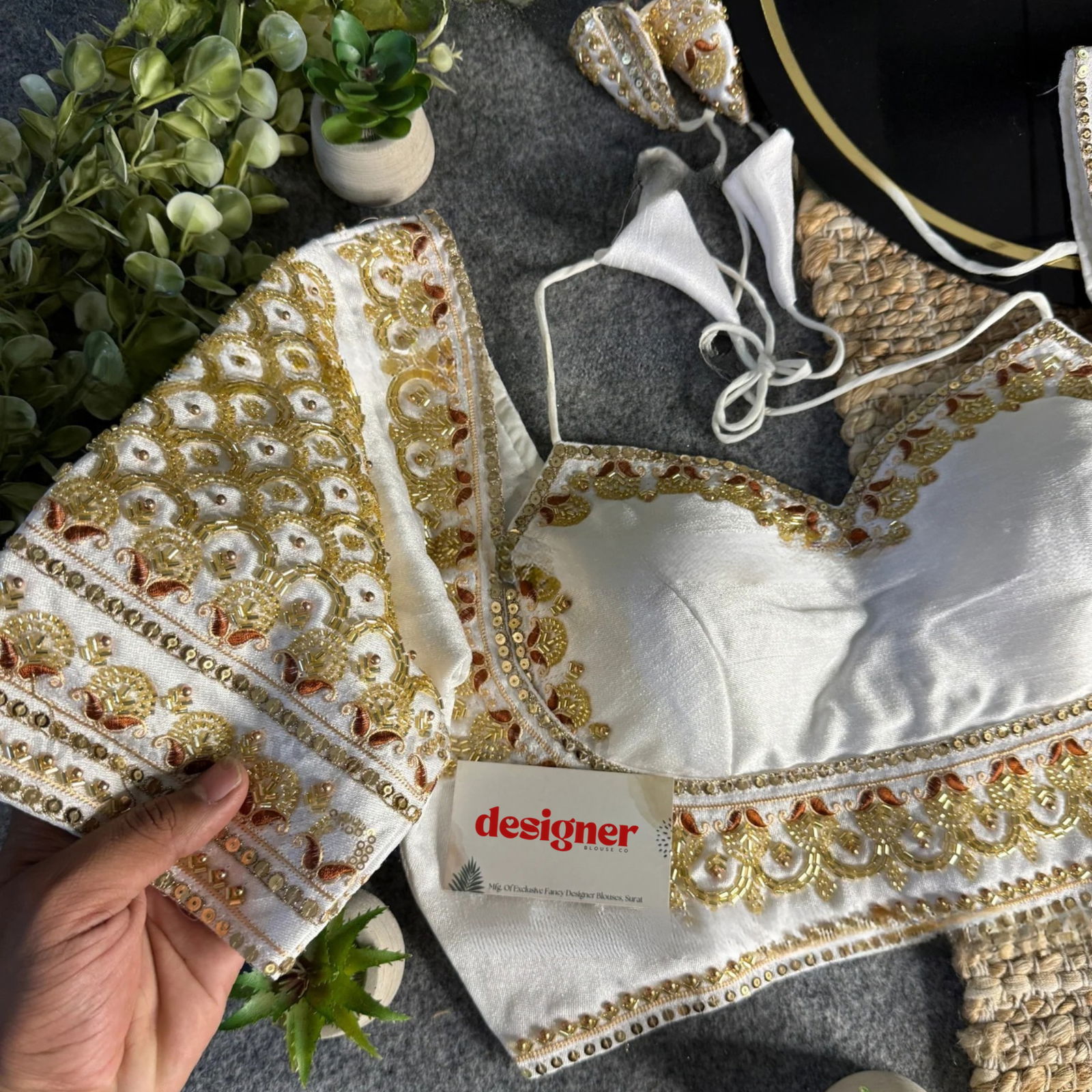 Elegant Italian Silk halter neck blouse with beautiful beads and rich embroidery work. Padded and back-open with hooks, this free-size designer blouse fits 34–42 bust and pairs perfectly with any saree or lehenga for weddings, receptions, and festive occasions.