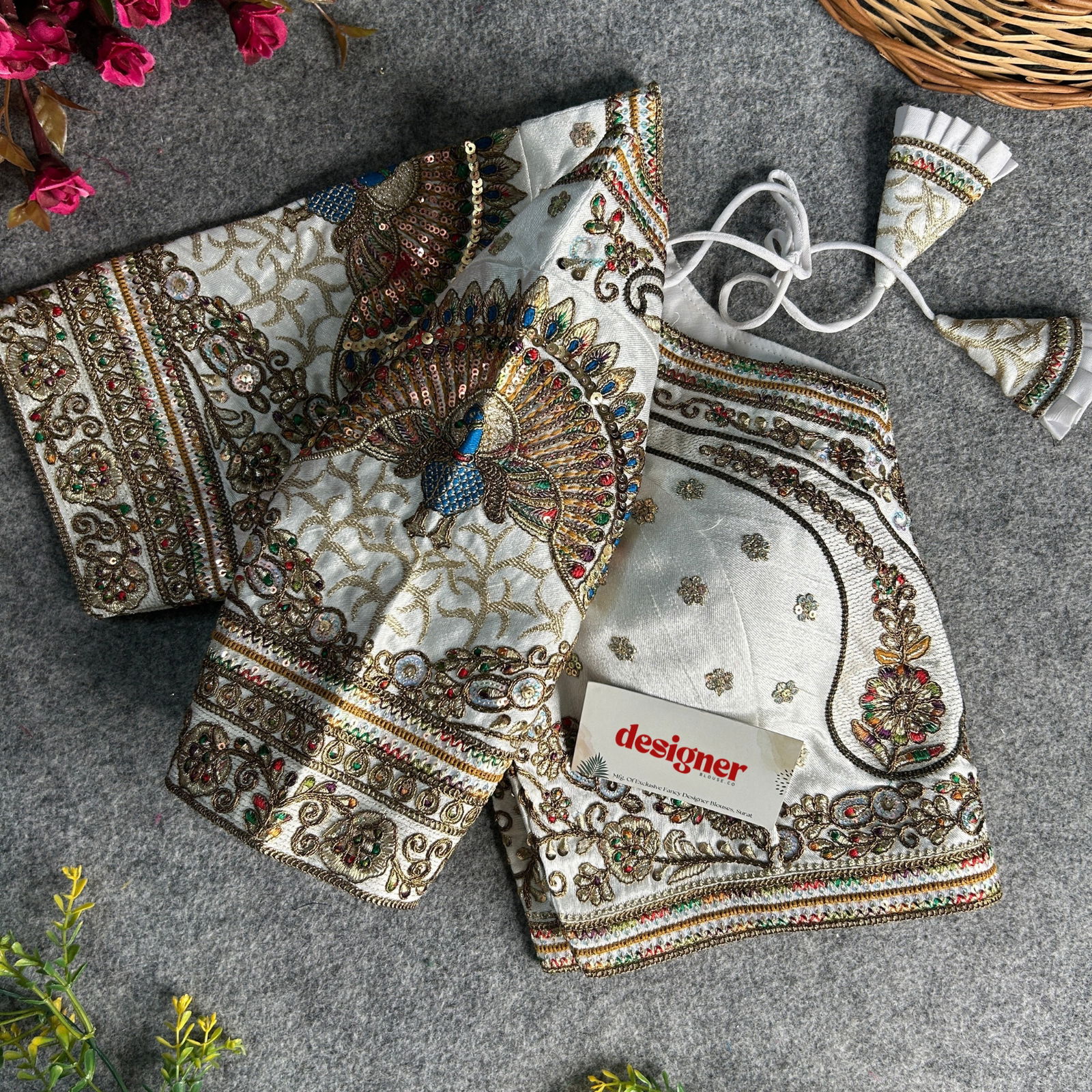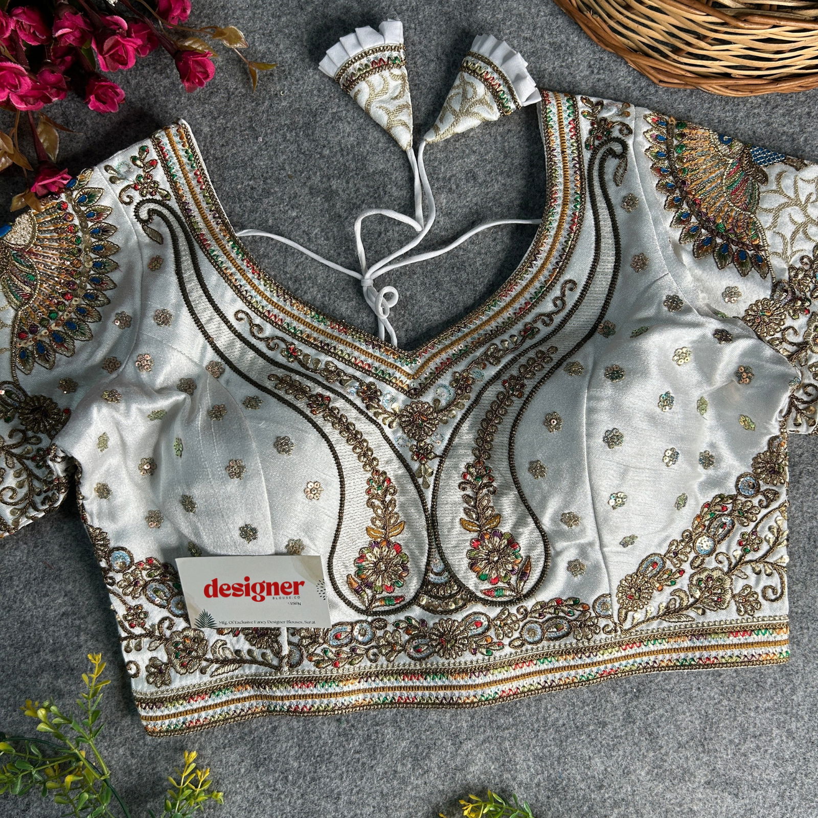 Elevate your wedding or party look with this exquisite heavy Italian silk blouse featuring 3D sequin detailing and unique embroidery work. Designed for comfort and glamour, it includes, soft padding, and flawless stitching. The back-open style with handcrafted finishing makes it a standout choice for festive occasions.
