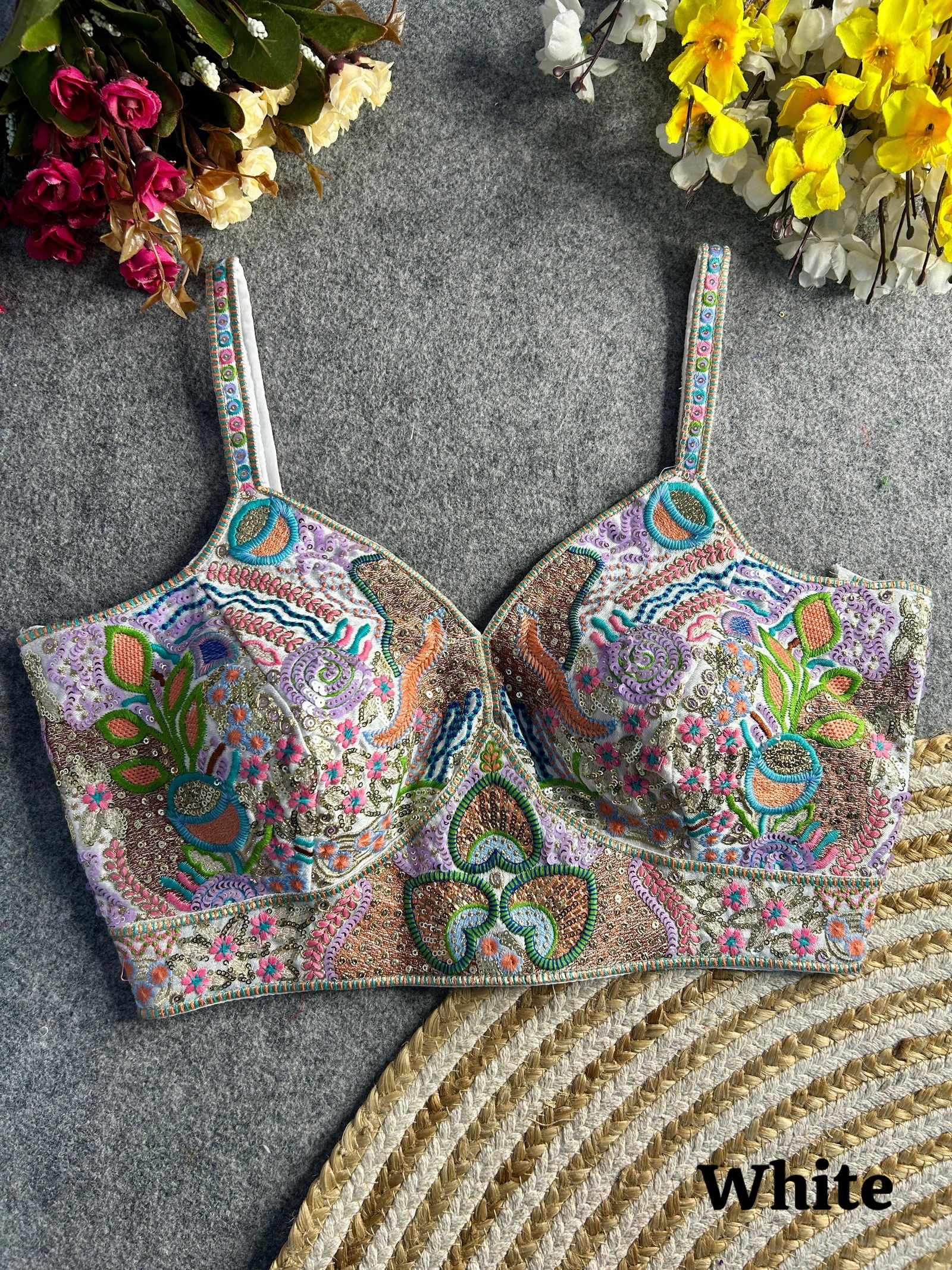 Elevate your ethnic wardrobe with this stunning sleeveless spaghetti blouse, crafted from luxurious heavy Italian silk. Adorned with intricate embroidery and sequence work, it exudes elegance and charm. Featuring heavy padding, fine stitching, and a stylish back-open design, this blouse is available in size 40, alterable up to 42-44 inches.