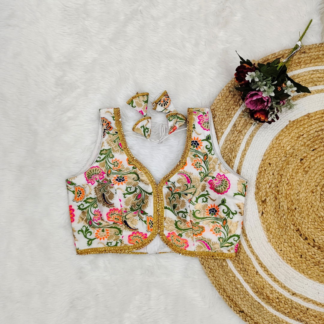 Elevate your Navratri style with our stunning Jacquard Fabric Blouse. Intricately crafted with heavy stitching and padding, featuring a beautiful apple cut design and back hooks open style, perfect for the festive Garba celebrations.