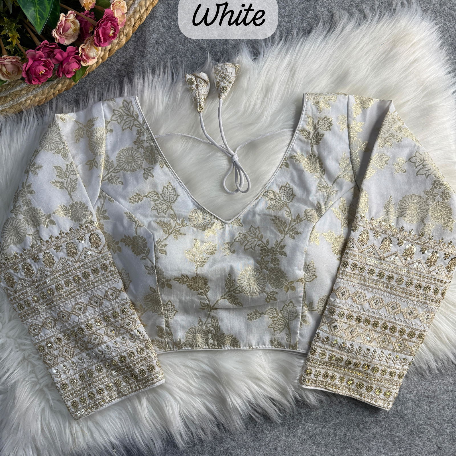 Experience timeless elegance with this heavy pure Dola silk blouse featuring intricate embroidery work. Designed for comfort and sophistication, it comes with a pure Indo cotton lining, 19-inch full sleeves, heavy padding, and detailed stitching. Available in 12 stunning colors, this back-open blouse fits size 40 and is alterable up to 42 inches.
