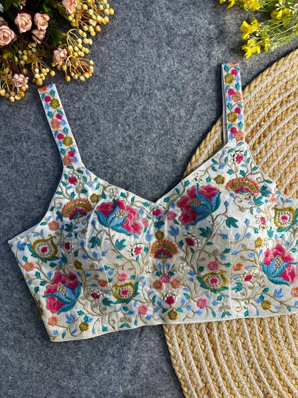 This stunning blouse is crafted from premium Pure Gajji Silk and adorned with intricate embroidery and real handmade mirror work. Featuring a back open style with cotton lining and soft padding, it offers a comfortable yet festive fit. Sleeveless and stretchable up to size 42, it’s perfect for special occasions.