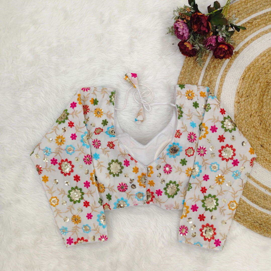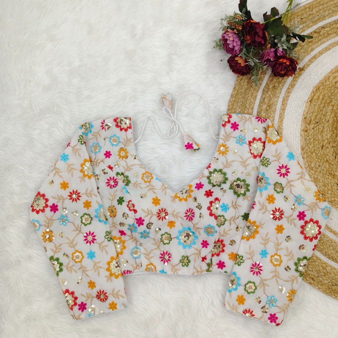 Stunning fox georgette blouse with intricate sequence work, featuring a stylish open-back design