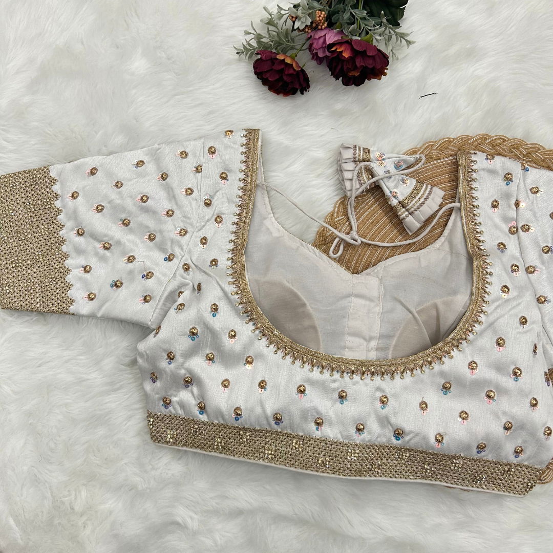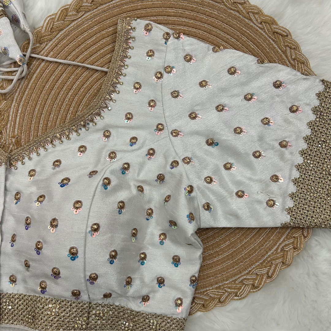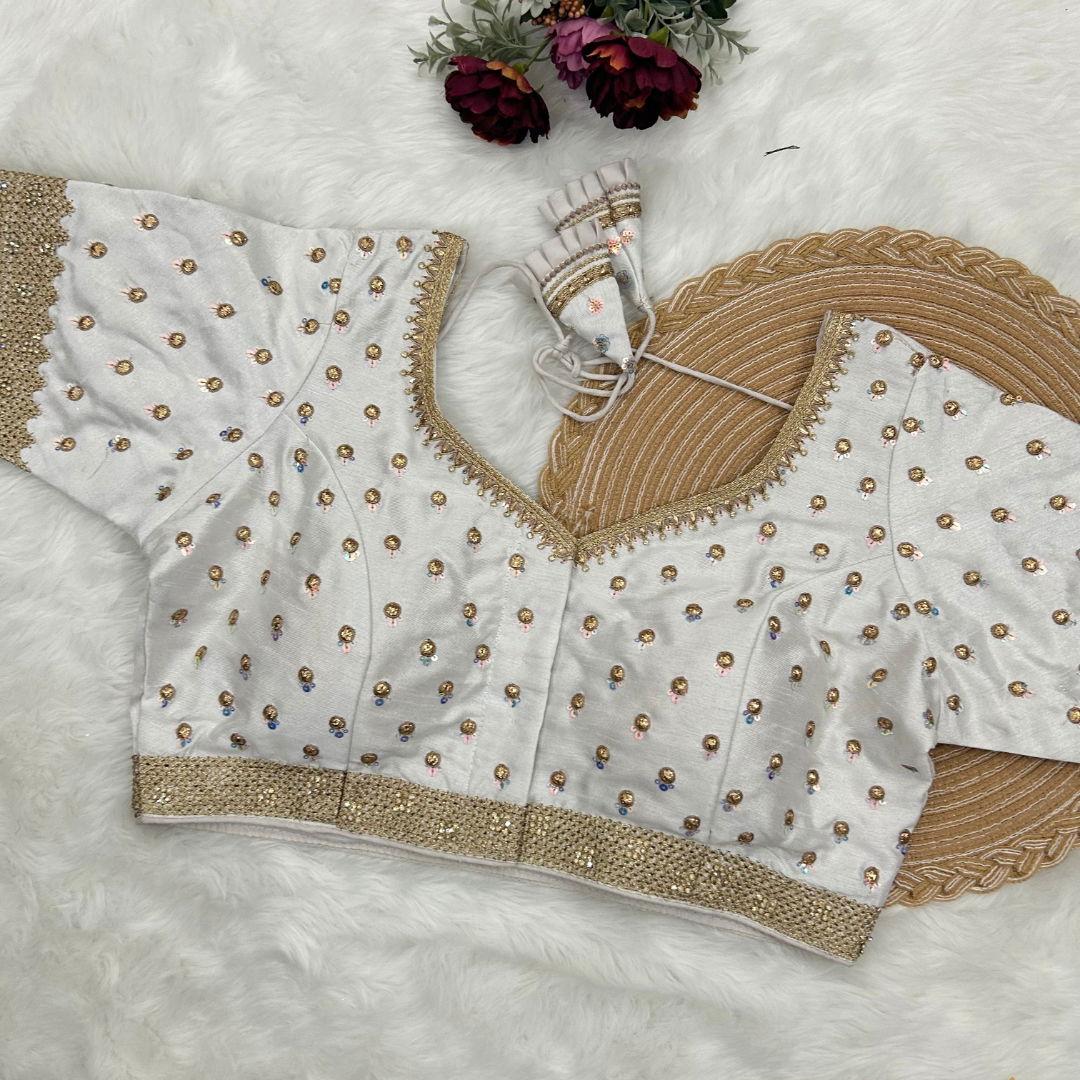 Exquisite Milan silk blouse, adorned with intricate thread sequence work, padded handmade hooks, and elegant front open design with charming latkan