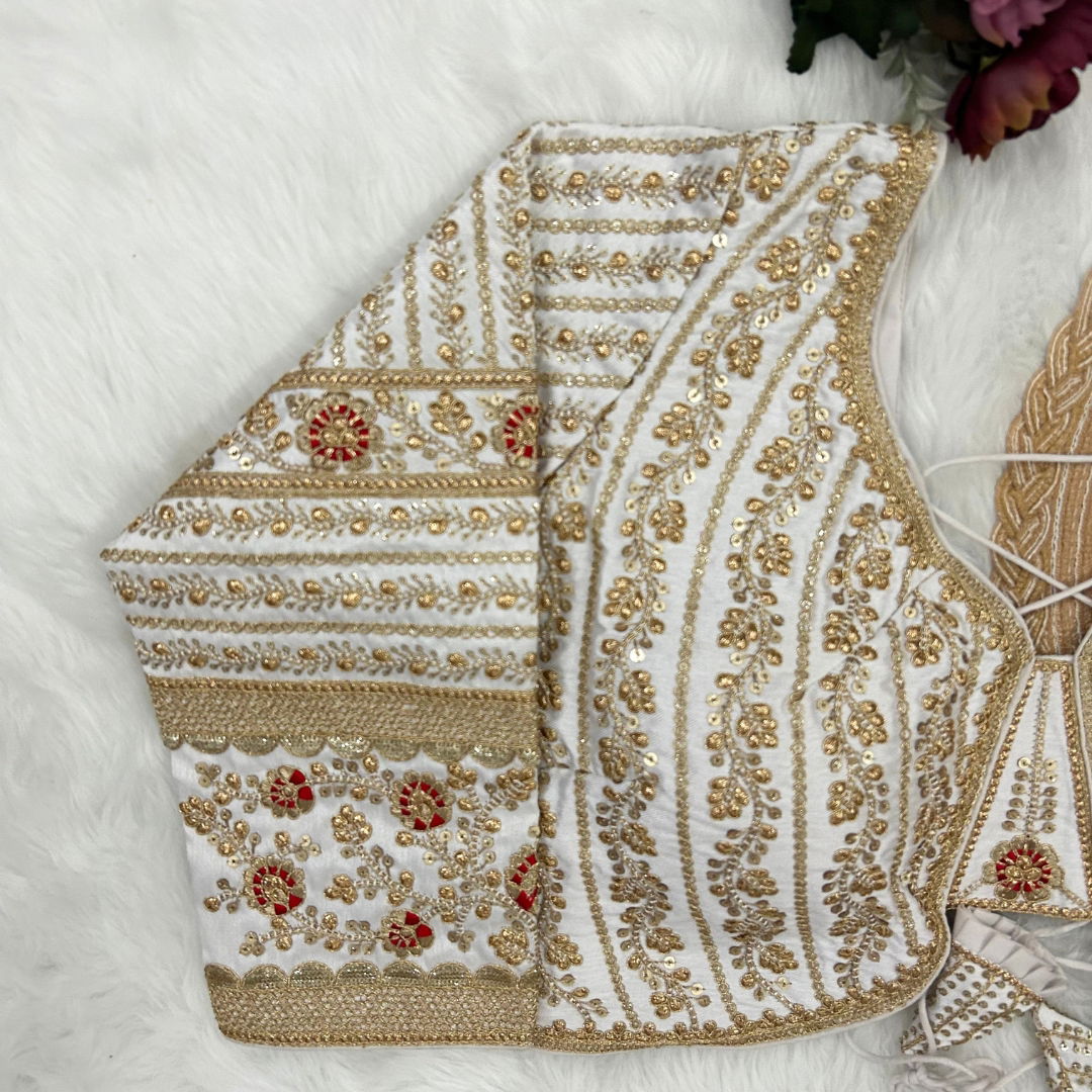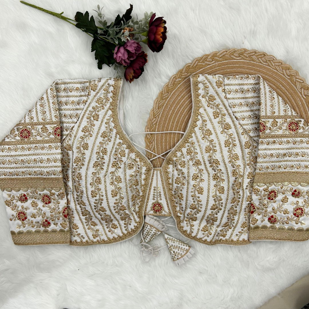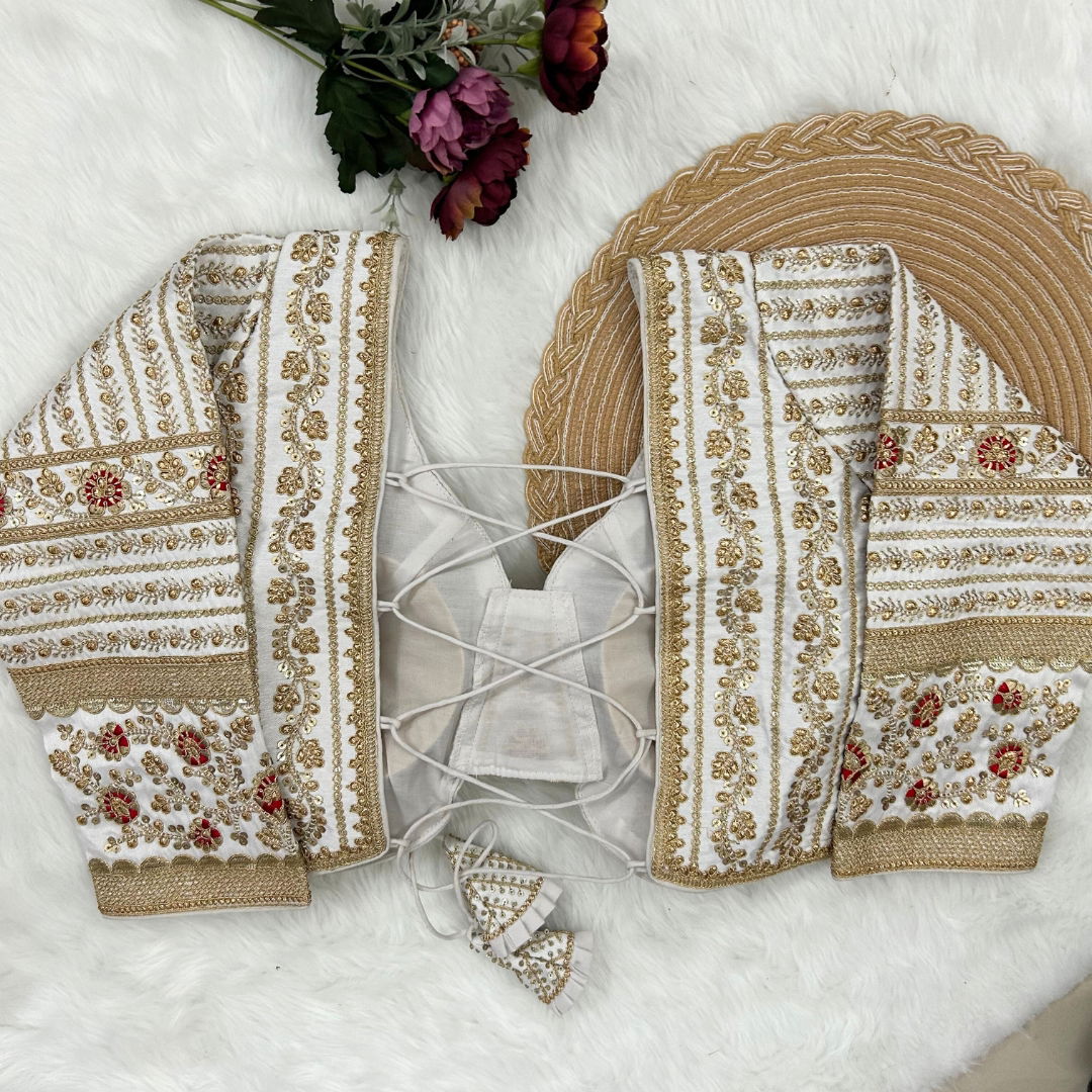 Make a statement in this beautiful bridal look blouse featuring a backless design with stylish dori. Crafted from rich Timo Silk, it comes with extra-long18-inch sleeves and soft padding for comfort. Perfect for weddings or special occasions, this designer blouse is ready in size 40 and alterable up to 44.