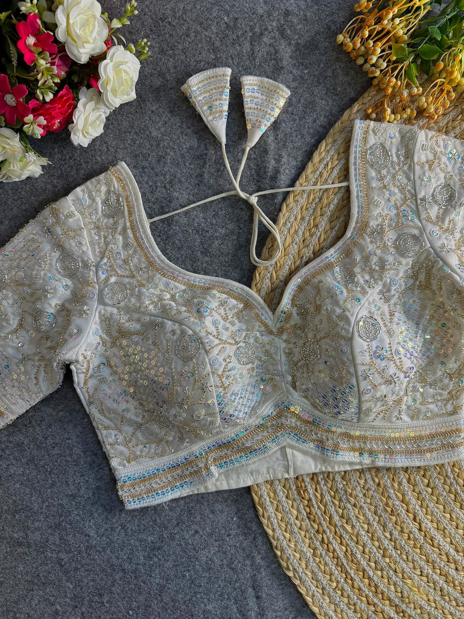 Make a dazzling statement with this Beautiful Heavy Stars & Beads Work Blouse, designed in luxurious soft Italian silk with tricot fusing. Adorned with intricate hand embroidery, sequence, and codding thread work, it features heavy padding, 12-inch attached sleeves, and handmade hooks. The back-open partywear design is perfect for special occasions.