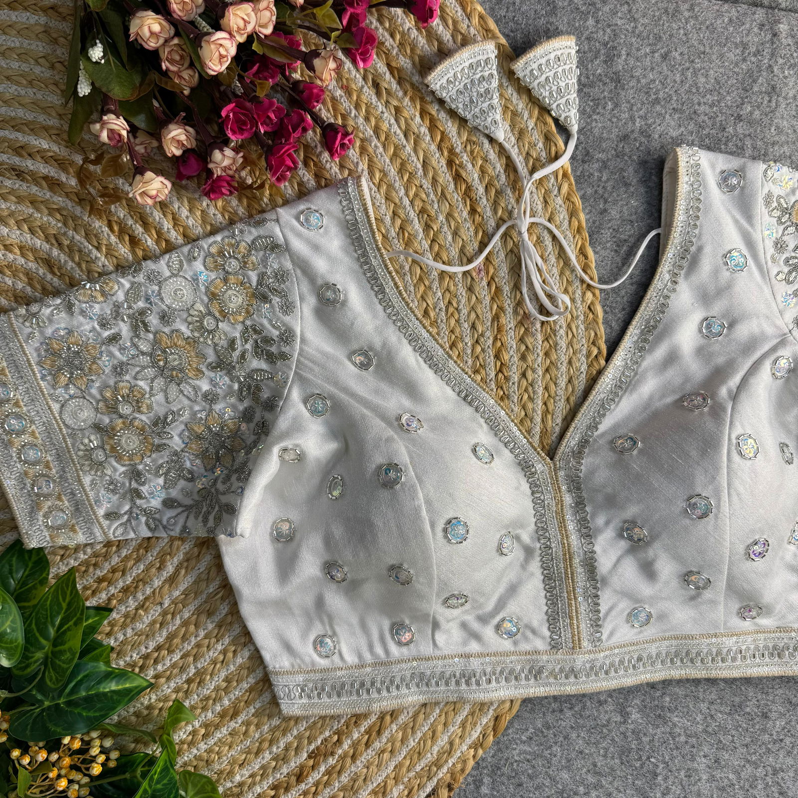 Elevate your bridal or party look with this Sabyasachi-style V-neck blouse. Made from heavy soft Italian silk, it features stunning copper matching beads, codding thread, and sequence work. With 12-inch sleeves, handmade hooks, and padded comfort, this designer blouse is perfect for weddings and grand occasions. Back open style adds elegance.