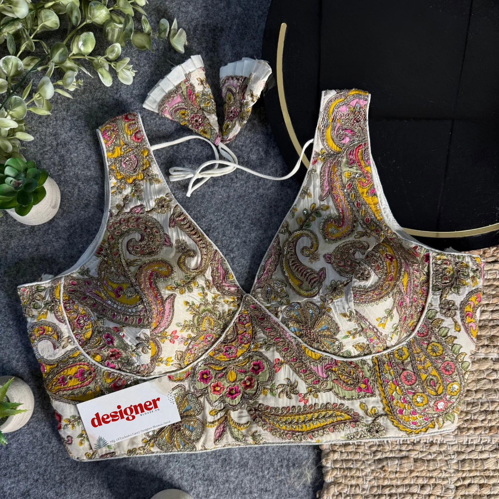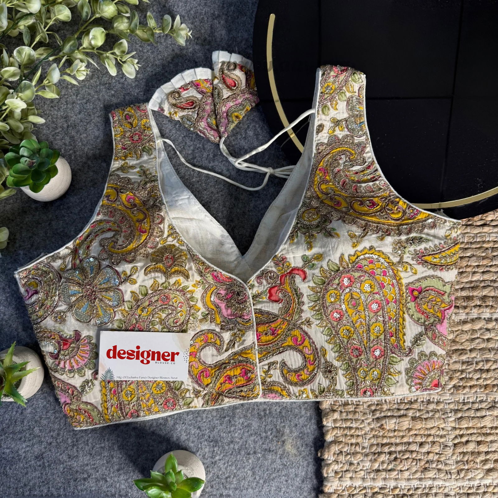 Embroidery Work V Neck Designer Blouse in premium heavy Chinnon fabric with exquisite position embroidery and stylish halter neckline. Comfortably padded with pure cotton lining, back open with hooks and attached inner sleeves. Free size, alterable up 34 to 42, perfect for all grand festive saree and lehenga looks