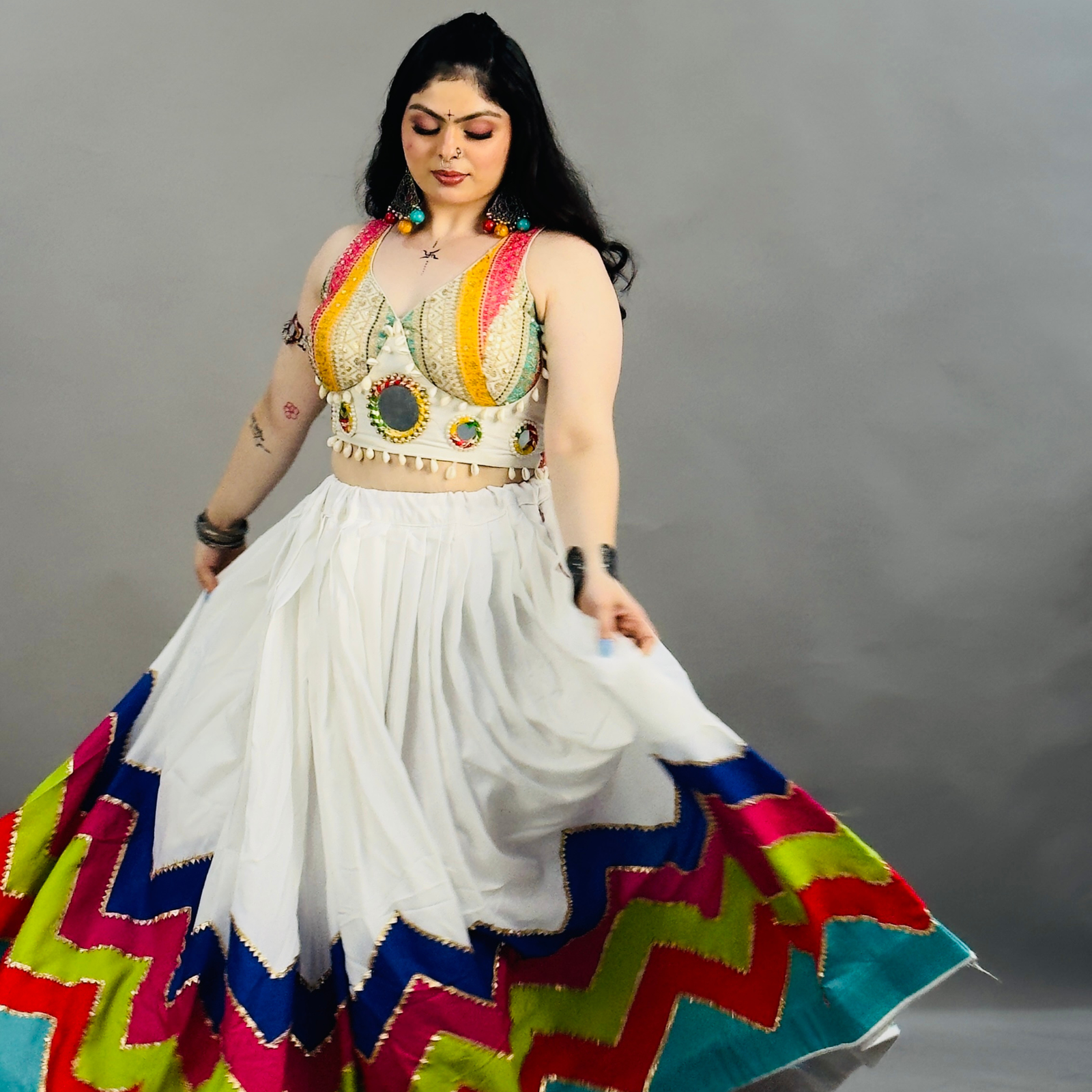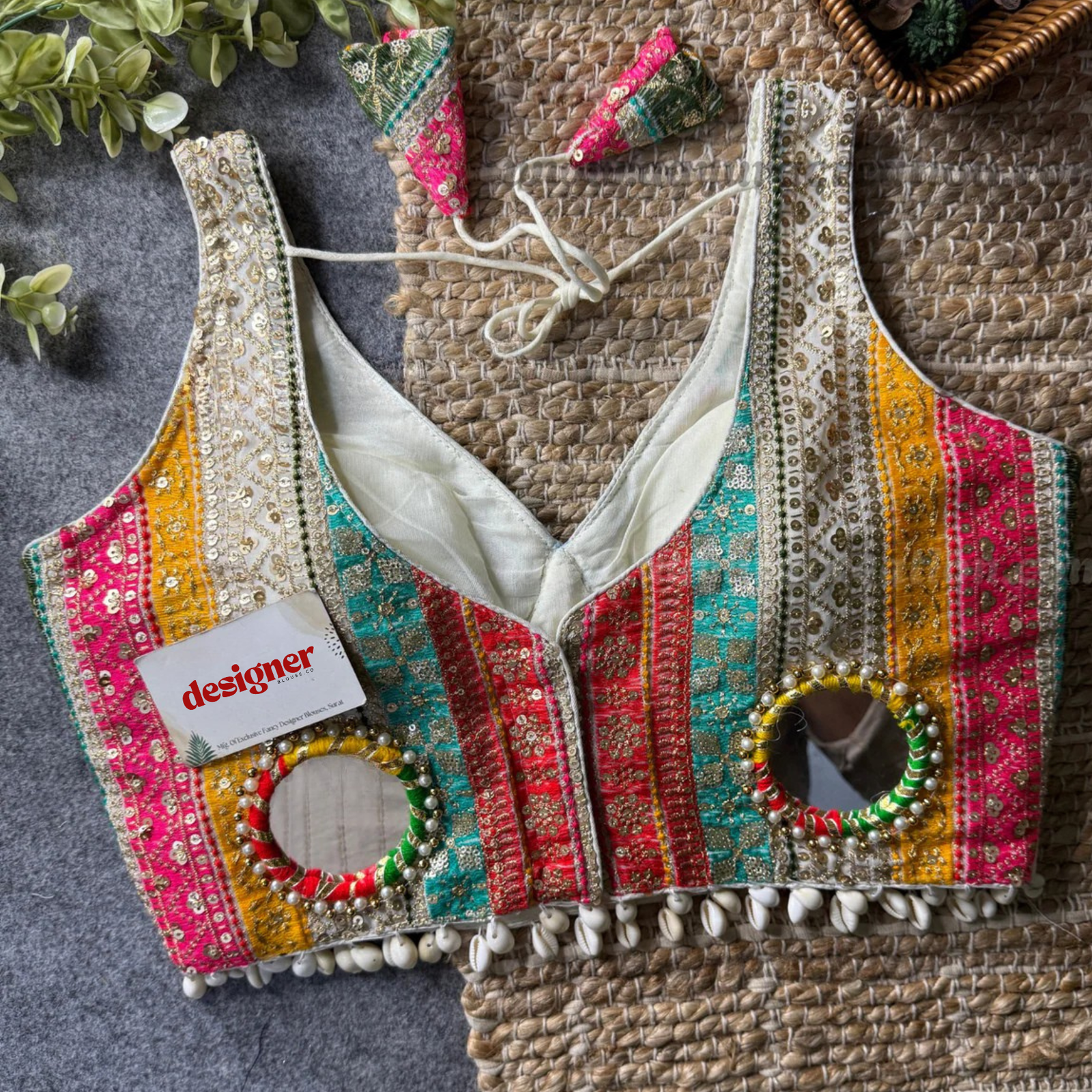 Elevate your festive wardrobe with this stunning designer blouse crafted in Cotton & Georgette. Adorned with elegant Kodi and Mirror Work, this piece adds a traditional yet stylish charm to your Navratri look.