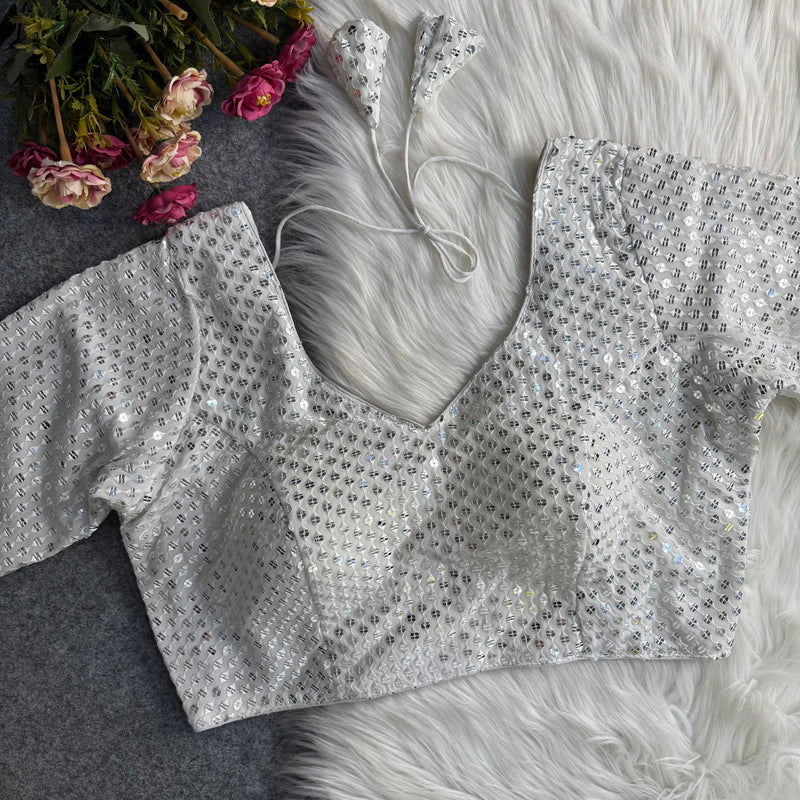 Dazzle this Navratri in our red Sabyasachi style blouse, crafted from premium fox georgette with intricate sequence work. This festive-ready blouse is perfect for Garba and Dandiya nights, featuring a designer neck pattern, padded comfort, and traditional charm. The rich red hue makes it a standout readymade blouse for Navratri.