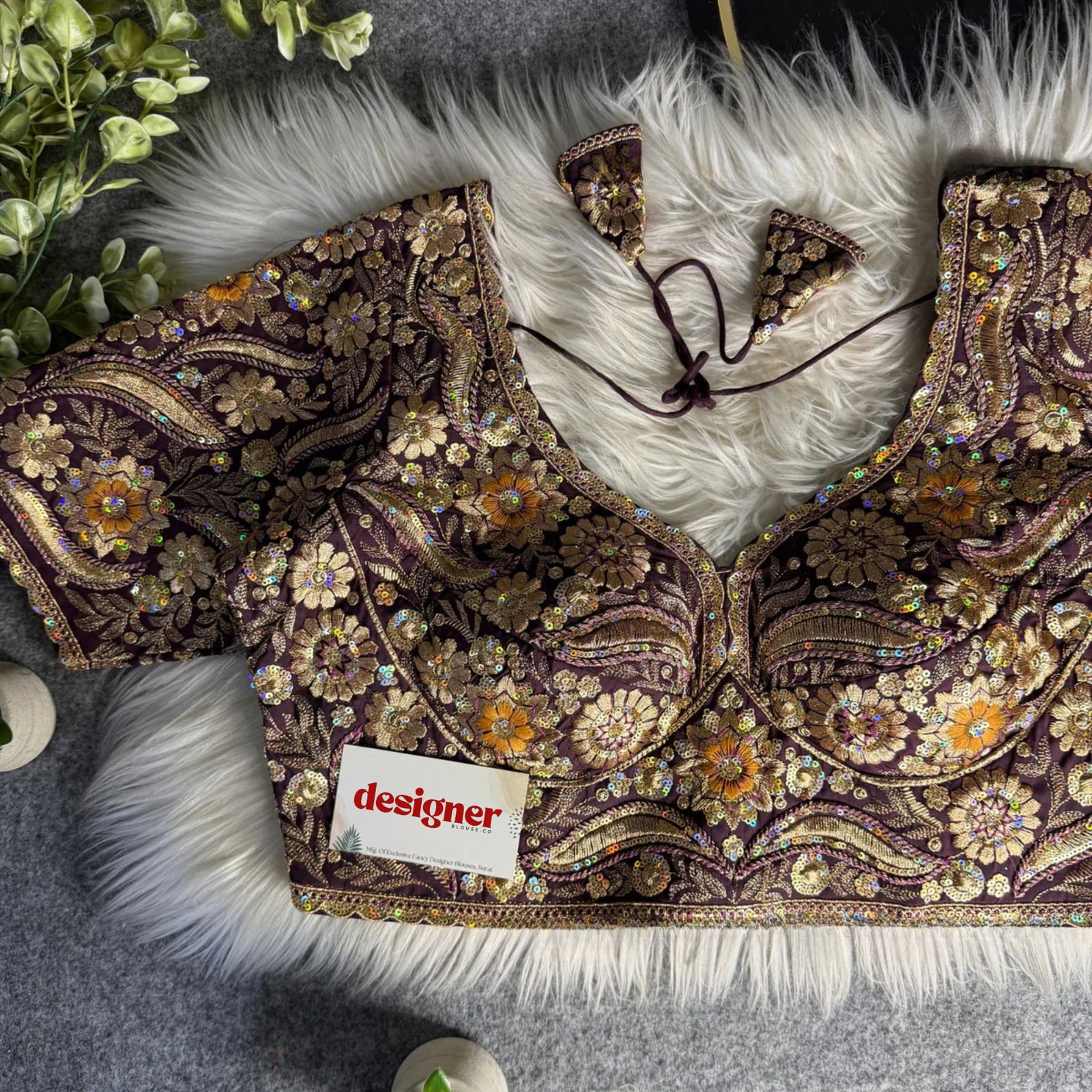 Elevate your bridal look with our Sabyasachi neck Italian Silk readymade blouse, richly embroidered with jari work. This designer bridal blouse offers a regal fit, cotton lining, and padding for comfort. Perfect for weddings, sangeet, and receptions, it pairs beautifully with sarees or lehengas for luxury and a radiant shine.