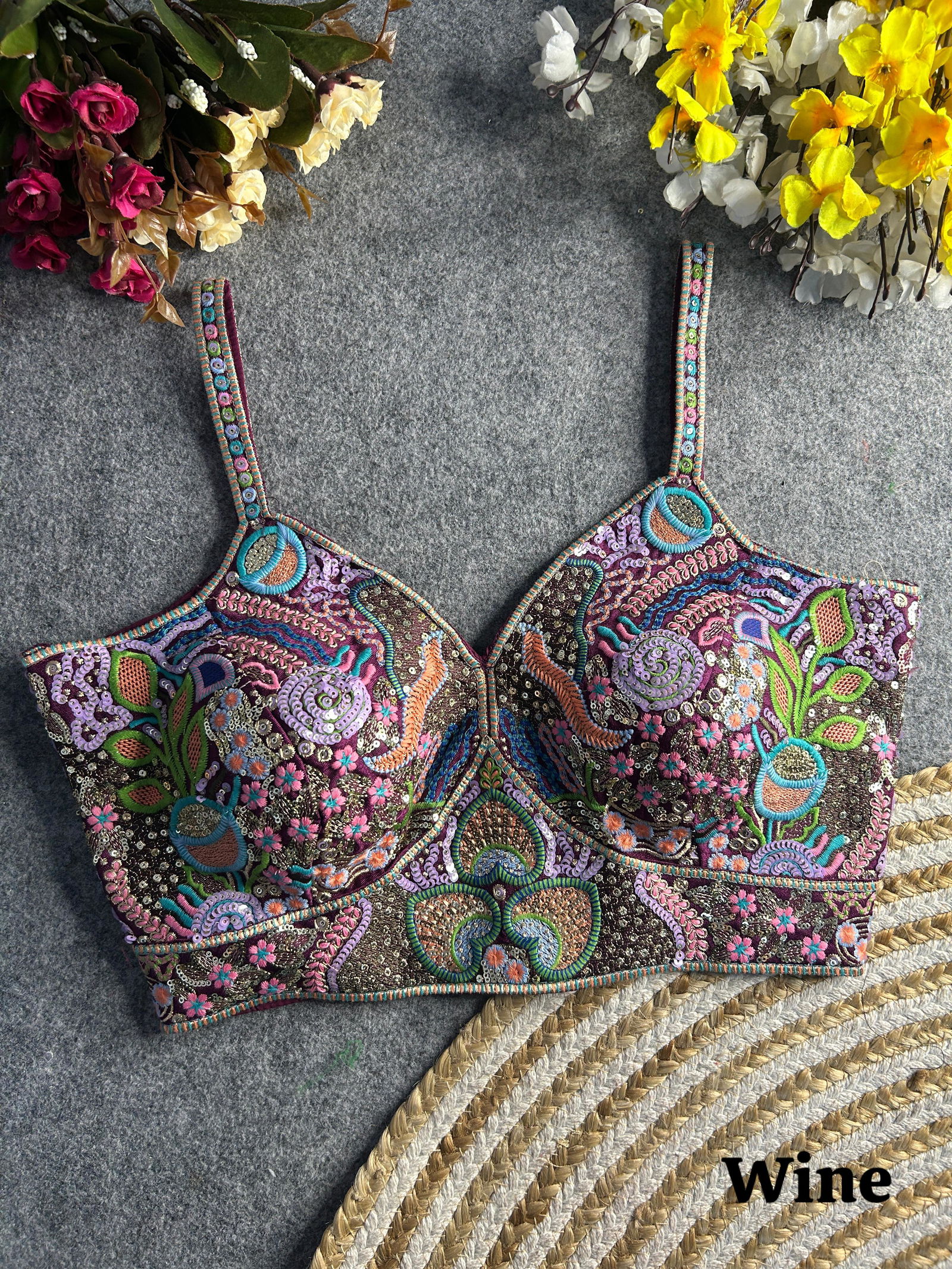 Elevate your ethnic wardrobe with this stunning sleeveless spaghetti blouse, crafted from luxurious heavy Italian silk. Adorned with intricate embroidery and sequence work, it exudes elegance and charm. Featuring heavy padding, fine stitching, and a stylish back-open design, this blouse is available in size 40, alterable up to 42-44 inches.