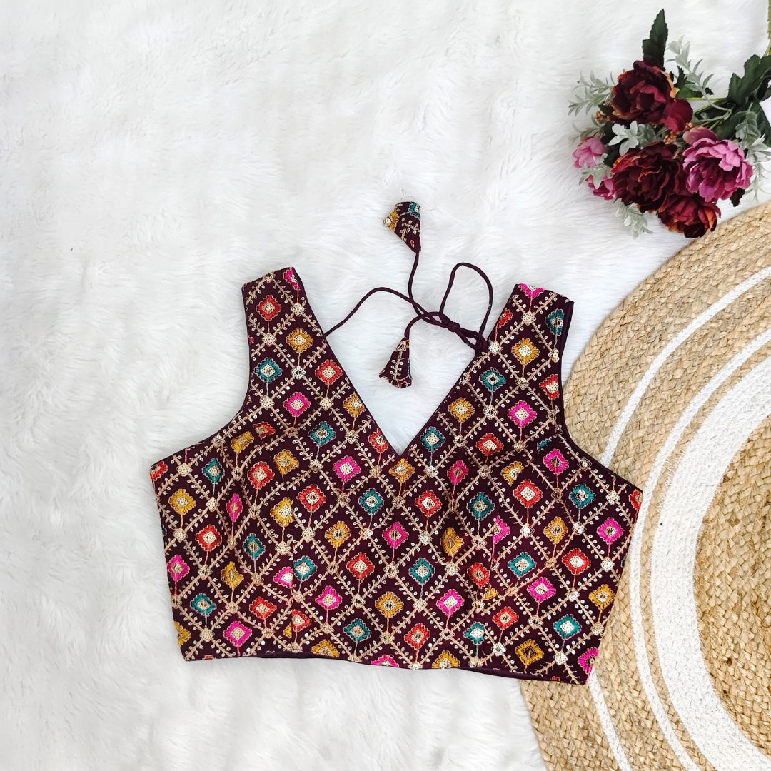 Georgette fabric blouse with multi-color embroidery, perfect for Navratri. Lightweight, vibrant, and stylish, ideal for festive celebrations. Enhance your look with this unique design.