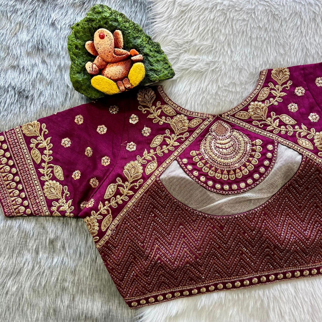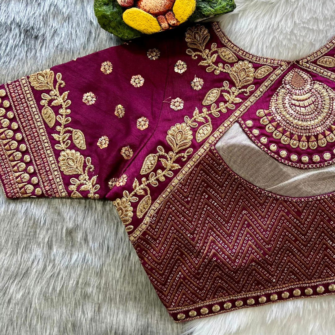 Introducing our exquisite "Heavy Wedding Blouse" crafted for the discerning bride seeking timeless elegance. This opulent blouse features intricate GOLD Jari with Rainbow 4 Sequence Heavy Embroidery Work, creating a dazzling masterpiece. The luxurious fabric, Heavy TIMO Silk, ensures a regal feel. Available in Plus Size 40” (alterable up to 42 inches), this blouse boasts a Beautiful Gold Work bridal design, meticulously stitched with Heavy Padded Handmade Hooks and adorned with Beautiful Latkans. The Front open Style adds a touch of modern sophistication. Elevate your bridal ensemble with this statement piece, a perfect blend of tradition and contemporary style.