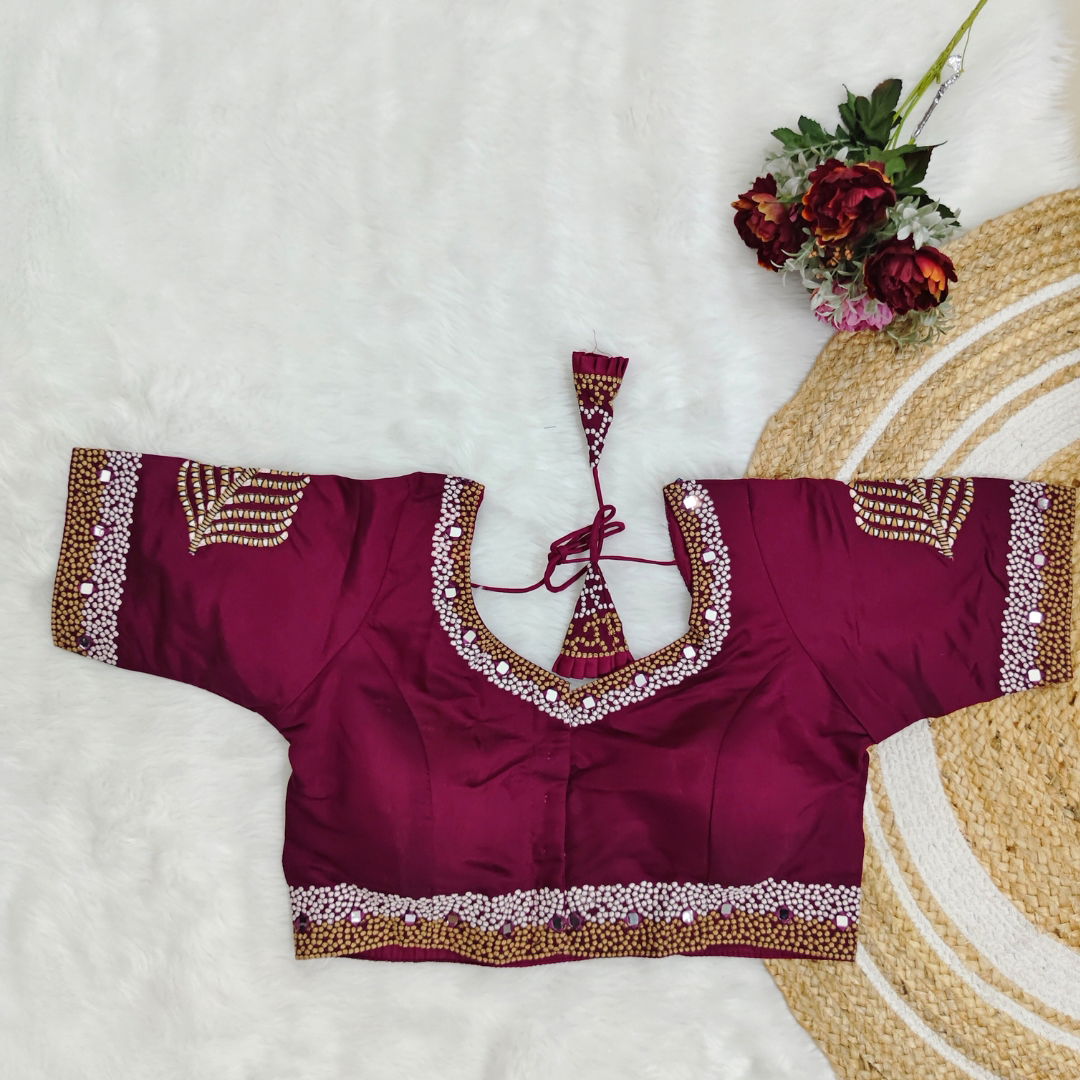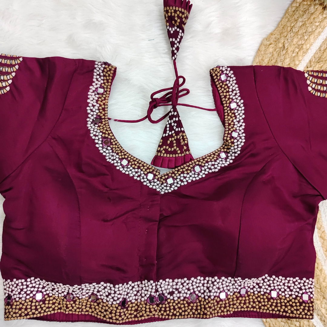 Pure Timo Silk handmade designer blouse with heavy thread embroidery and intricate handwork. Features real mirror embellishments. Elegant, unique, and perfect for special occasions.