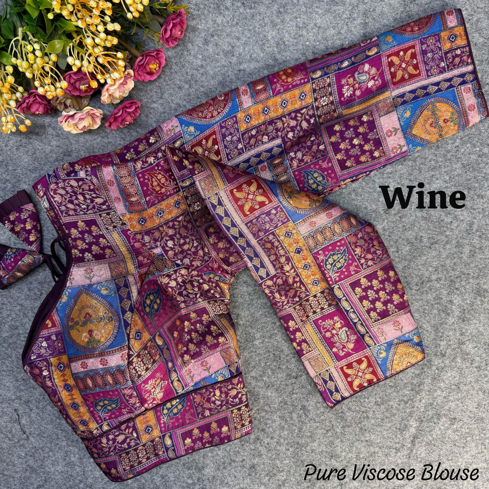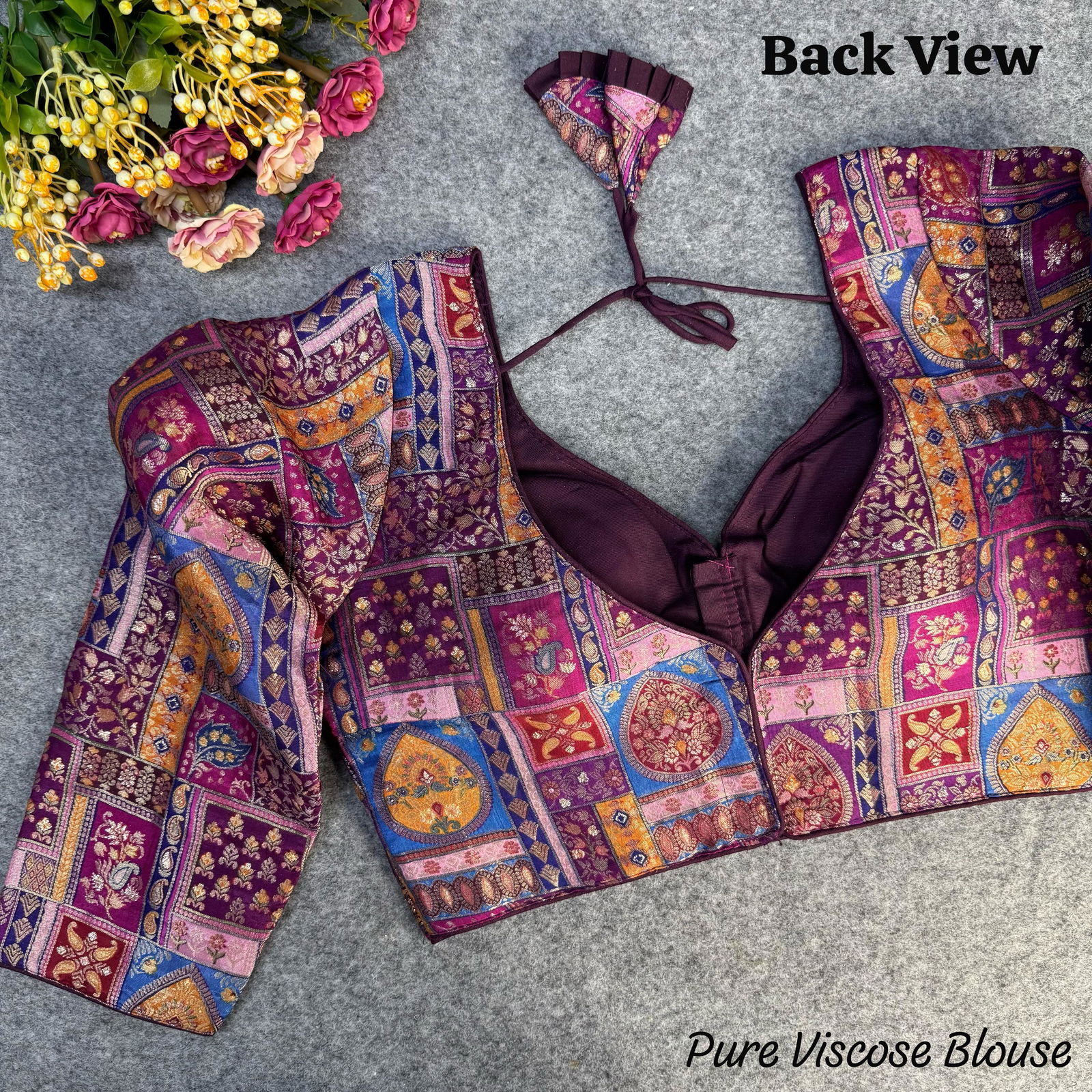 Embrace vintage elegance with this stunning long-sleeve blouse crafted from heavy pure viscose jacquard. Featuring exquisite position print work, heavy stitching, and padding for a structured fit, this blouse is designed to make a statement. The back-open style with delicate latkans adds charm. Available in 6 beautiful colors, ready in size 40, alterable up to 42 inches.