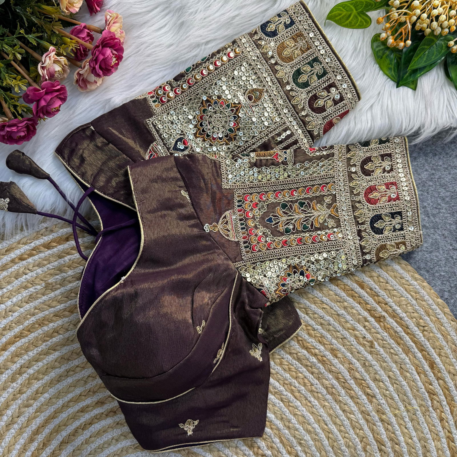Designed for a flattering fit, this blouse features a round neckline and half sleeves, ensuring both comfort and style. The fine detailing and premium craftsmanship make it an ideal match for silk sarees, lehengas, or even fusion wear. Pair it with statement jewelry and a designer drape to create a mesmerizing traditional look.