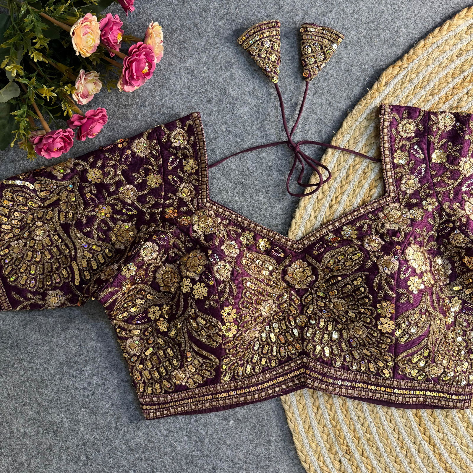 Grace your bridal look with this designer blouse crafted from heavy pure soft Italian silk. Featuring elegant codding embroidery and sequin work, it’s heavily padded with fine stitching. The back-open style with handmade hooks and latkans adds charm, making it perfect for weddings and grand celebrations.
