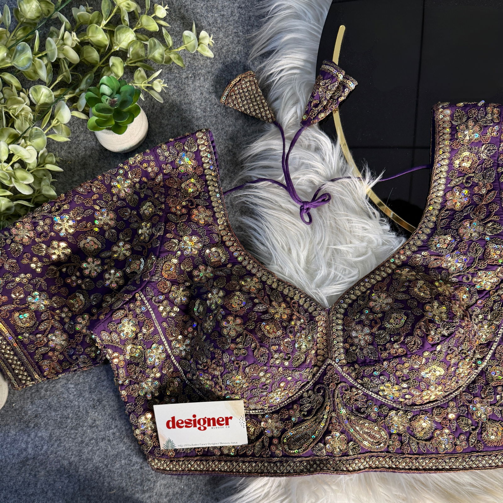 Italian Silk Heavy Coding & Sequence Work Sabyasachi Neck Designer Blouse, crafted in heavy Italian fabric with rich coding and shimmering sequin handwork. half-sleeve, padded, back open with hooks and pure cotton lining for comfort.