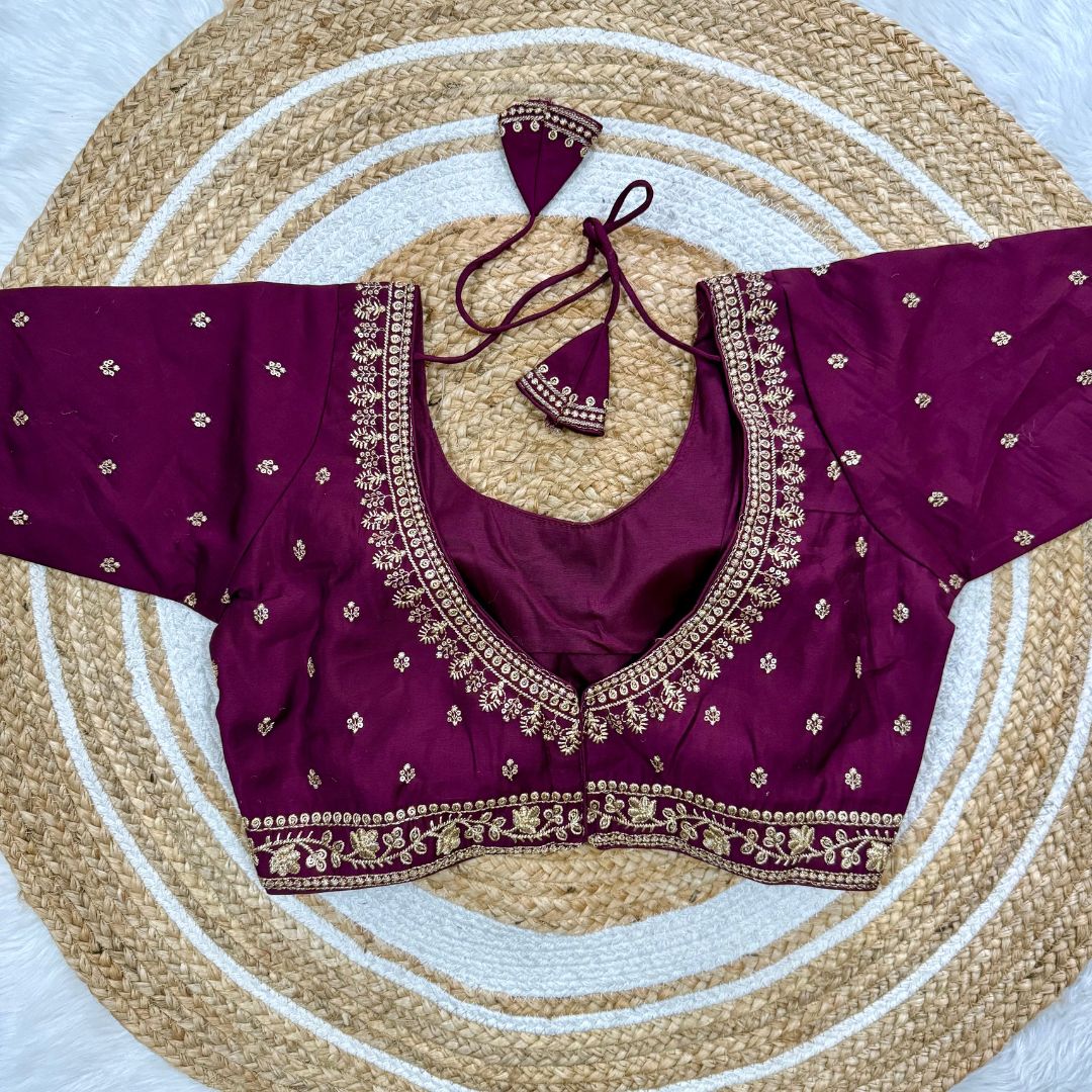 Shine effortlessly at weddings and special occasions with this exquisite bridal blouse. Made from heavy pure Roman silk, it features intricate embroidery and sequence work, 10-inch embroidered sleeves, heavy padding, and handmade hooks with charming latkans. Available in 10 stunning colors, this back-open style is ready at size 38 and alterable to 40 inches.