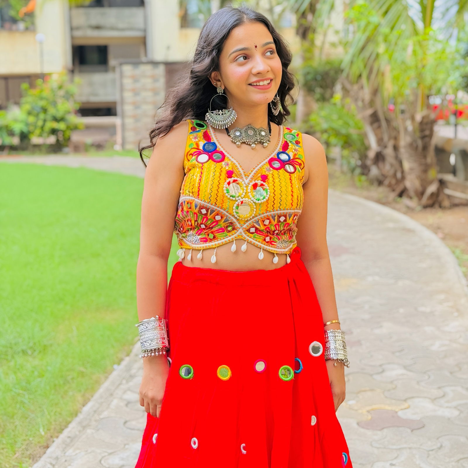 Step into the festive season with our Heavy Embroidery Mirror Work Chaniya Choli Set for Navratri. This stunning outfit features intricate embroidery and mirror embellishments, adding a touch of elegance and tradition. Perfect for Garba nights and festive celebrations, this readymade chaniya choli offers both style and comfort for your special occasions.