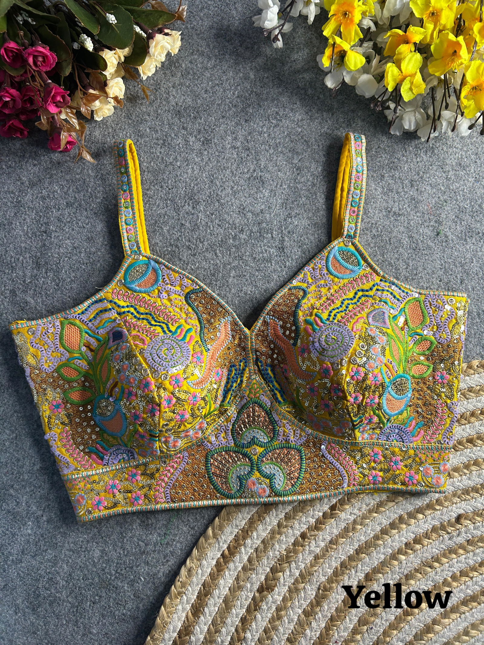 Elevate your ethnic wardrobe with this stunning sleeveless spaghetti blouse, crafted from luxurious heavy Italian silk. Adorned with intricate embroidery and sequence work, it exudes elegance and charm. Featuring heavy padding, fine stitching, and a stylish back-open design, this blouse is available in size 40, alterable up to 42-44 inches.
