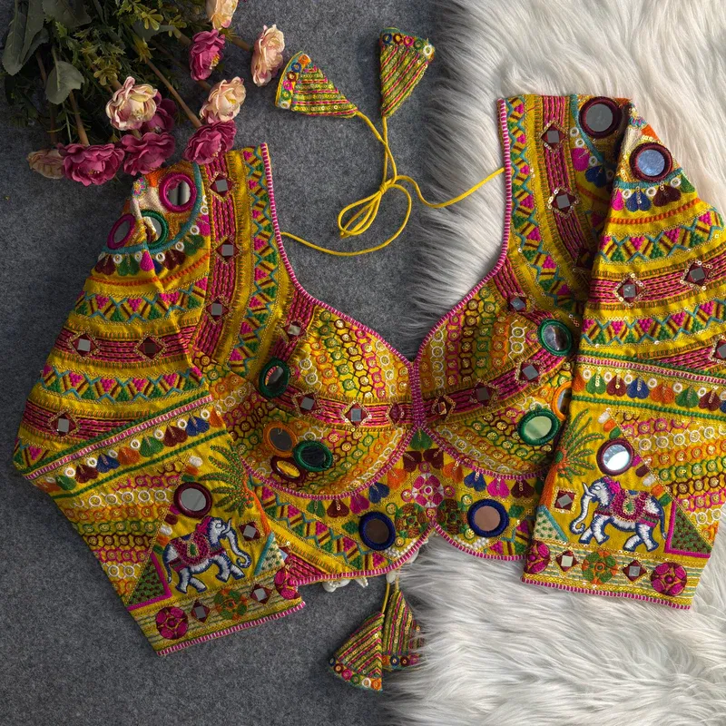 Make a dazzling statement this Navratri with our Yellow multicolor full sleeves mirror work blouse. Designed for Garba nights, this blouse features heavy embroidery, hand mirror detailing, and rich sequence on premium Italian silk. Perfect for traditional flair, it adds elegance and sparkle to your Navratri outfit with its stylish back-open fit.