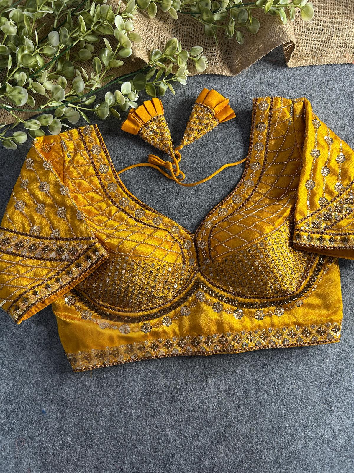 Elevate your bridal look with this exquisite Sabyasachi-inspired blouse, meticulously crafted with heavy handwork, sequins, and cording thread embroidery. Featuring intricate beadwork and a stunning array of stars, this blouse is designed for the modern bride who seeks elegance with a touch of opulence.