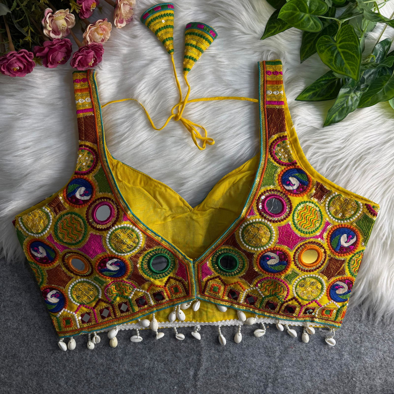 Get ready for Navratri, Garba, and Dandiya nights with this stylish readymade blouse. Made from rich Heavy Italian Silk, it features a fancy Gamthi and Shell Lace design. The blouse is padded, stitched beautifully, and perfect for festive nights. A must-have readymade blouse for your ethnic celebration look.