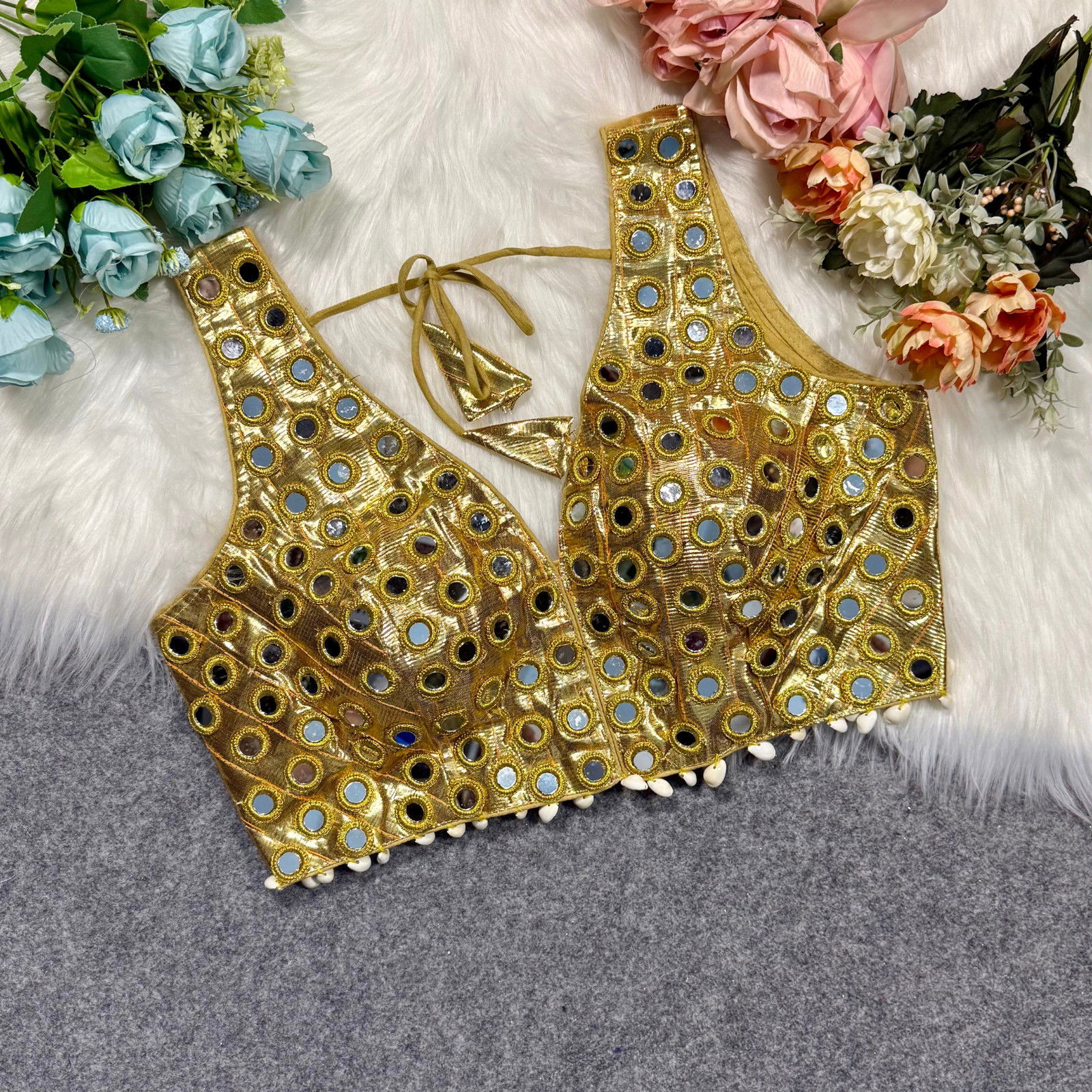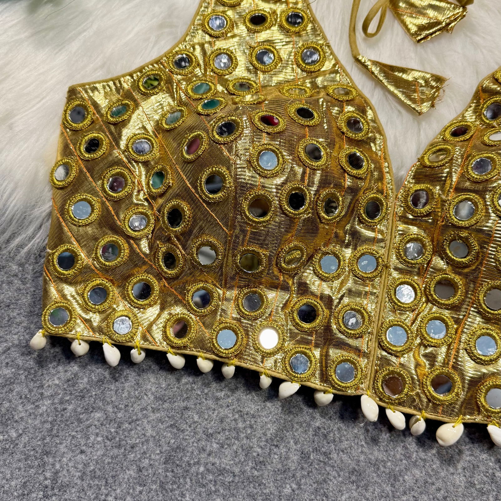 Shine bright in this Navratri readymade blouse, featuring vibrant multi-color circular mirror work and a classic dori-tie back. Crafted for festive flair, it’s adorned with shell lace for that authentic dandiya vibe. Perfect for Garba nights, this blouse pairs beautifully with lehengas, skirts, or sarees for an eye-catching traditional look.