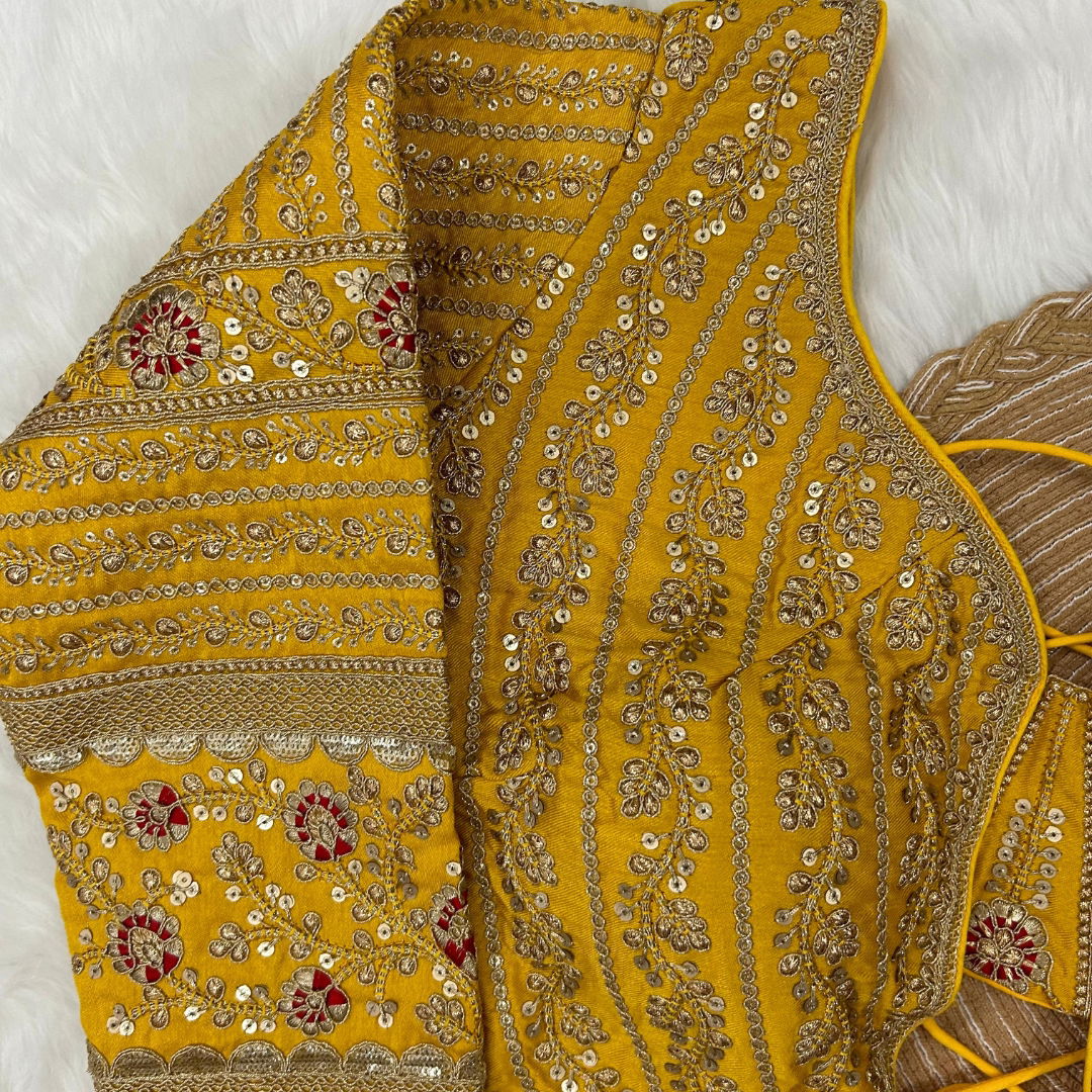 Make a statement in this beautiful bridal look blouse featuring a backless design with stylish dori. Crafted from rich Timo Silk, it comes with extra-long18-inch sleeves and soft padding for comfort. Perfect for weddings or special occasions, this designer blouse is ready in size 40 and alterable up to 44.